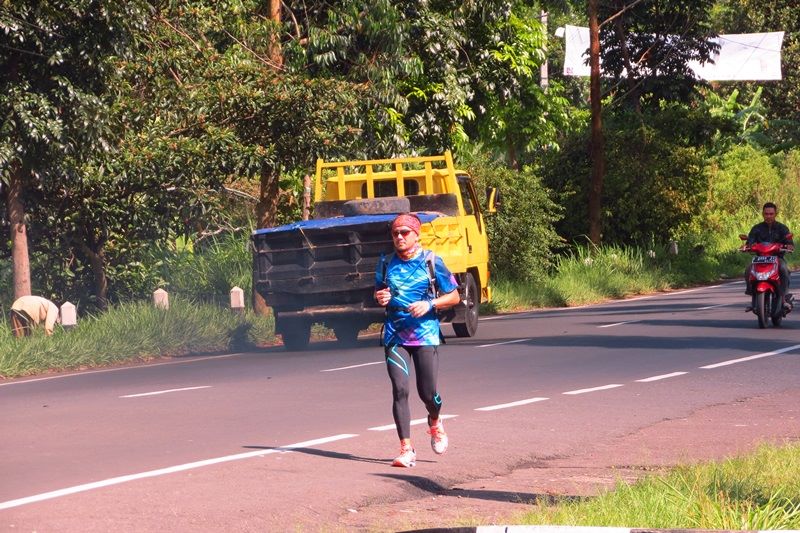 Setelah istirahat sejenak di CP III, plus semangka yummynya, Cianjur, I’m coming! Berlari di bawah terik matahari yang mulai tinggi, ternyata jalur 12,5 KM ini, setelah tikungan tapal kuda itu, lurus dan, astaga, memang panas! Saya membayangkan dahi yang akan bergaris belang akibat sebagian tertutup Buff. Oh ya, di tengah jalan, setelah lari 50 KM, kami masih sempat membantu seorang ibu menyeberang di jalan raya Cianjur yang ramai. (Eh, tuh ibu sebenarnya mau nyeberang gak yah?).