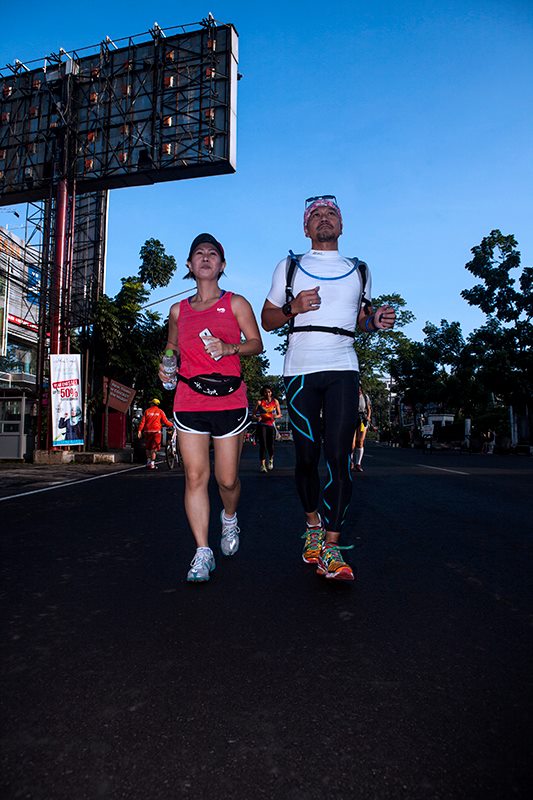 Istirahat sekitar 10 menit di CP pertama, kami mulai berlari lagi, dengan rombongan lebih kecil, saya bersama Aprillya, Rahmat, Arie. CP II adalah Puncak Pass (Aiihhh…), sekitar 22,5 KM menunggu di depan mata. Sepanjang jalur itu kami lalui dalam dingin dengan kibasan kendaraan malam setiap kali melewati kami. Ini jalur dengan banyak, istilah Rahmat, tanjakan lucu (tanjakan Puncak, apanya yang lucu?). Yang pasti kami (kami? saya!) malah suraksurakdalamhati kalau melihat tanjakan. Alamat “boleh” berjalan, excuse paling valid dan manusiawi. (Di sepanjang jalur sampai menjelang subuh, ada Iyung yang selalu muncul di setiap minimart, tidak kurang dari 5 minimart, mirip malaikat pencabut nyawa gentayangan. Thanks Bro, walaupun gua gak ngerti persis lu ngapain sih?!)
