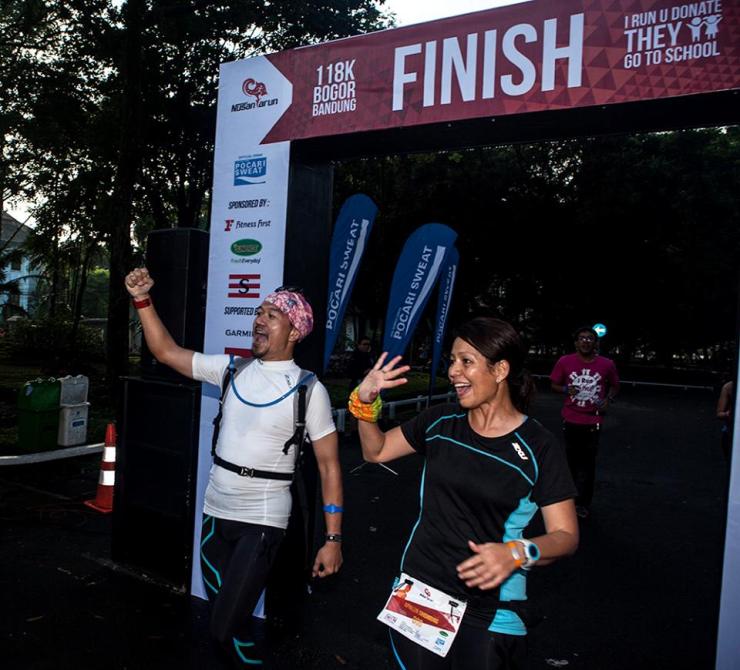 Setelah mengganti baju kering dan sepatu kering, Lya dan saya bersiap untuk menuju ke CP terakhir sebelum finish line di Balai Kota Bandung. Jalan praktis menurun dan datar, tentu lebih nyaman untuk berlari, walau harus sambil menghalau lelah dan kantuk. Melintasi gerbang Kota Parahyangan Baru, dan terus berlari ke CP VII, pompa bensin yang berlokasi menyatu dengan Indra Medical Clinic. Akhirnya, 105,5 KM tuntas dan yang tak terlupakan adalah senyum manis teman-teman penyambut dan martabak manisnya!