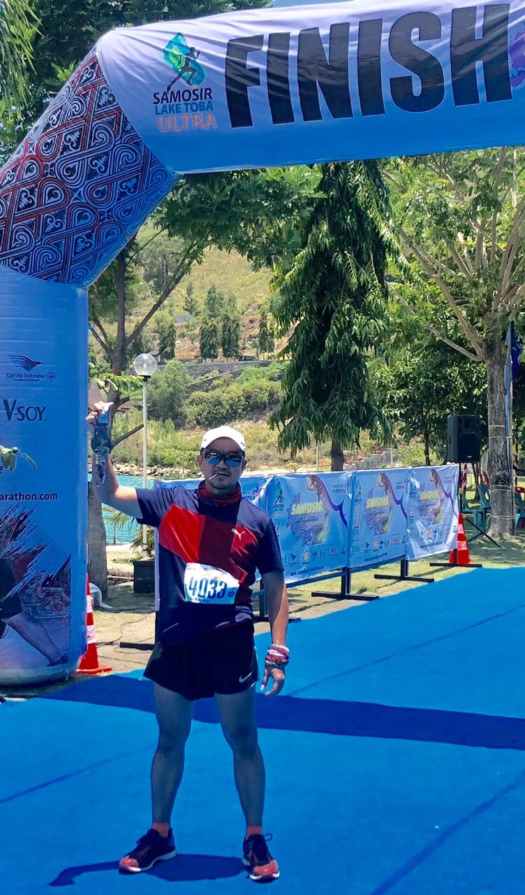 Start sesuai jadwal, meleset sedikit saja. Cakep! Berlari dalam gelap dengan sedikit saja lampu rumah penduduk. Beberapa KM pertama sempat membuntuti dua cewek bule yang ngobroolll teruusss. (Asem! Saya berusaha atur napas ngosngosan, mereka sambil ngobrol.) Pemandangan sisi kiri, Danau Toba baru saja terbangun. Semburat sinar tipis matahari antara merah dan kuning mulai terlihat di timur, di antara gunung bukit. Lampu-lampu tambak-tambak mengapung di pinggir danau mulai dimatikan. Berkali-kali saya menengok ke arah sana, menikmatinya. Indah!