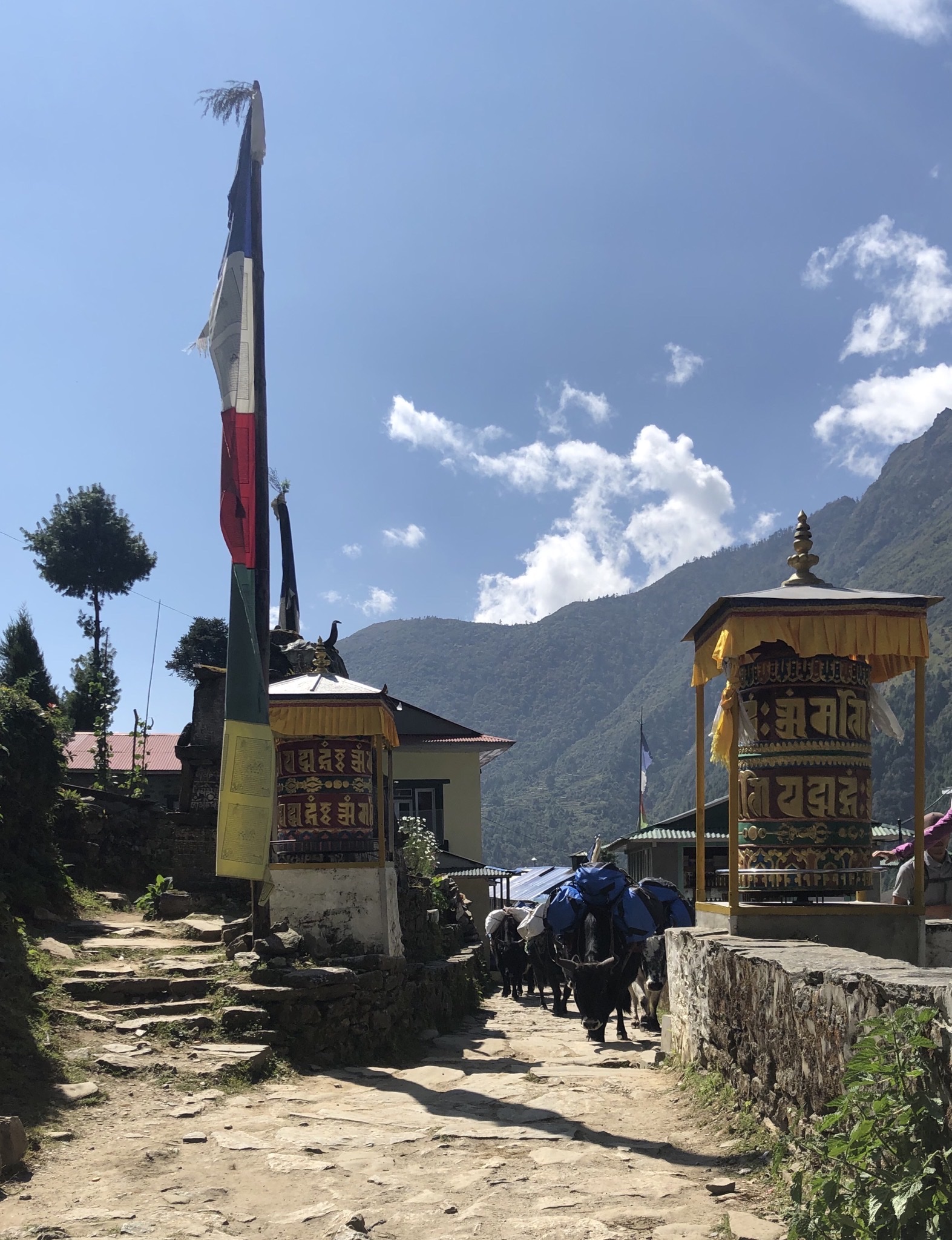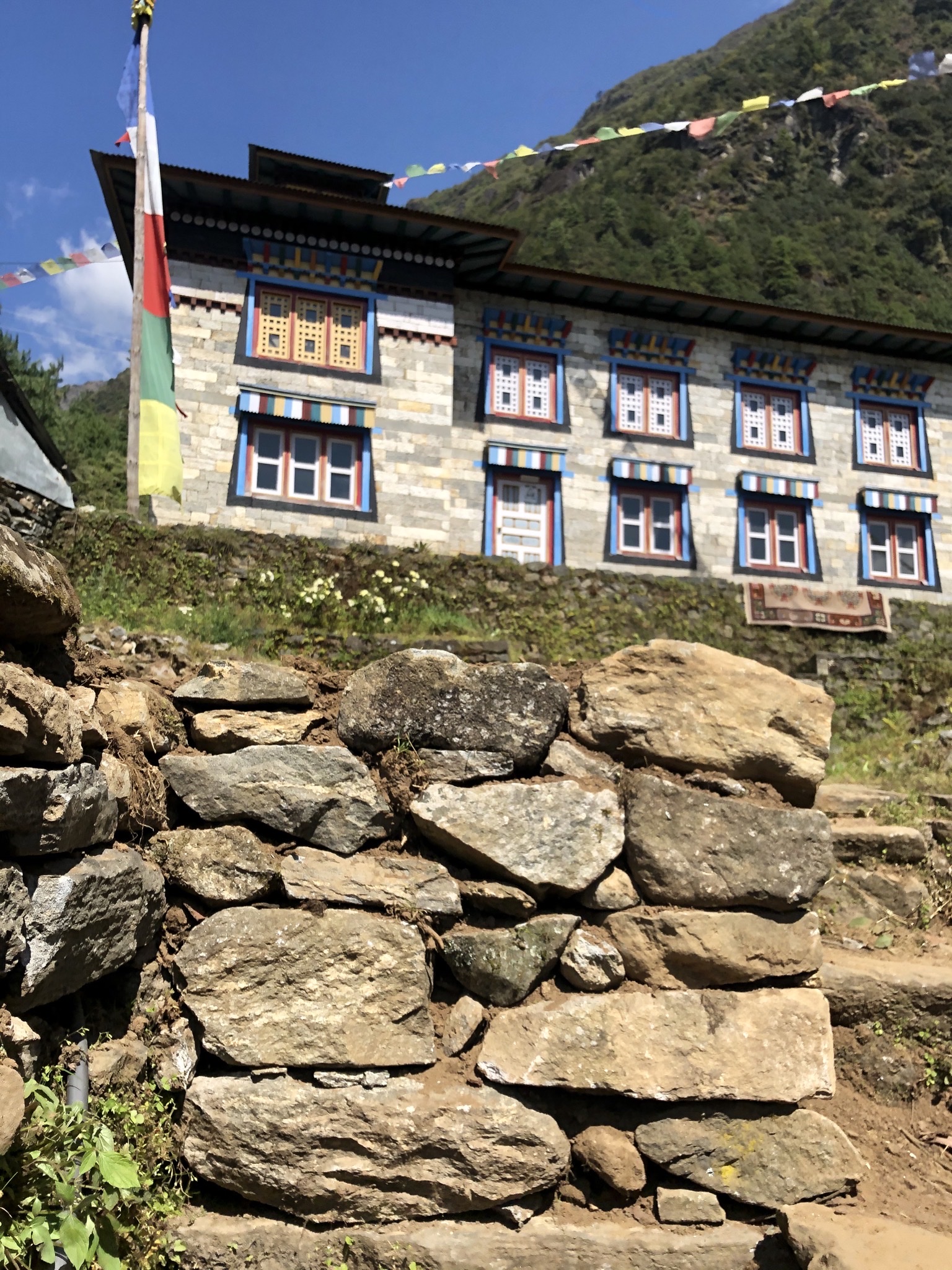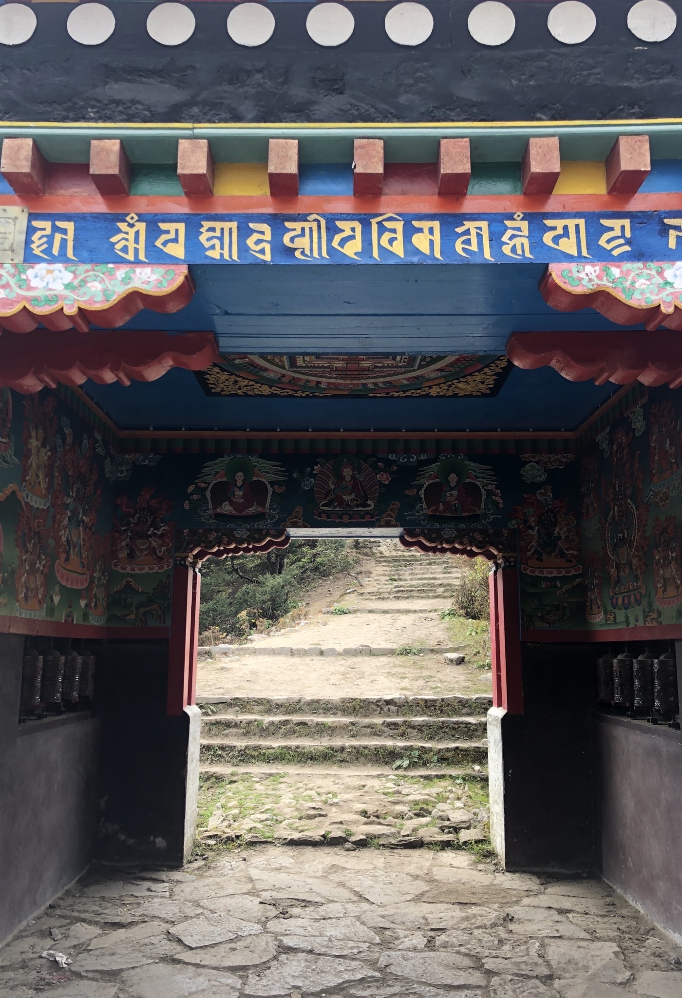 Sebuah gerbang warna-warni di sisi kiri lodge berdiri megah. Di sampingnya tampak indah Tyangboche Monastery. Sebuah gerbang lain, yang disusun dari banyak batu menyerupai gerbang, mengingatkan foto delapan tahun lalu. Masih sama, plus papan tulisan kecil “Way to Namche”, hanya saja tanpa ketiga jagoanku, (Miss You, Guys!) Perjalanan Sang Waktu…