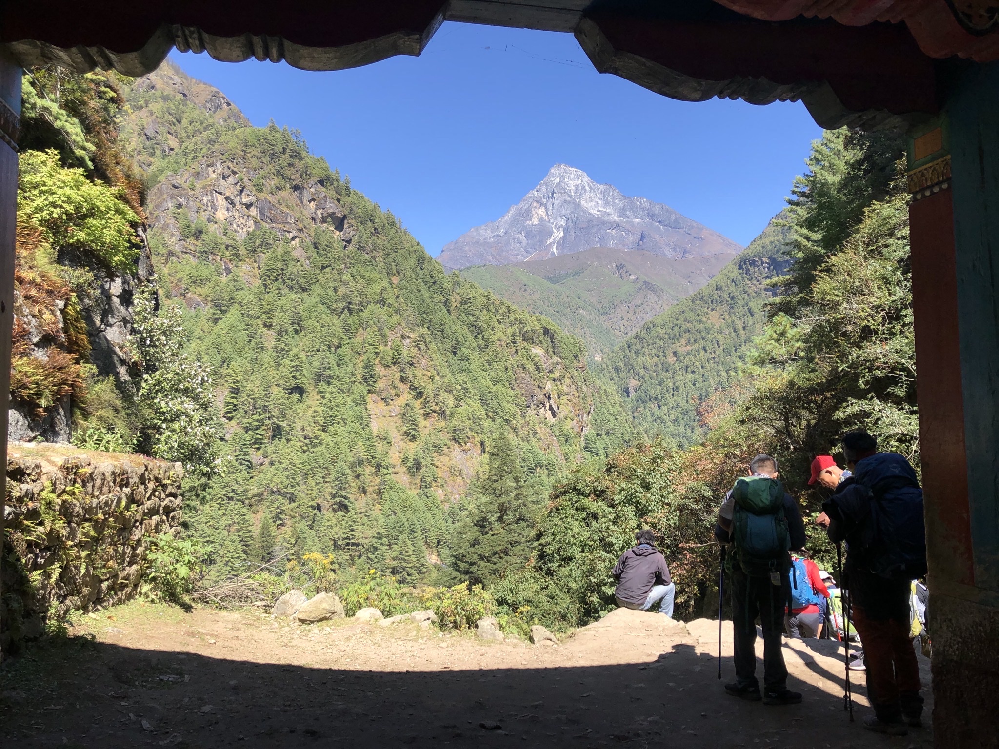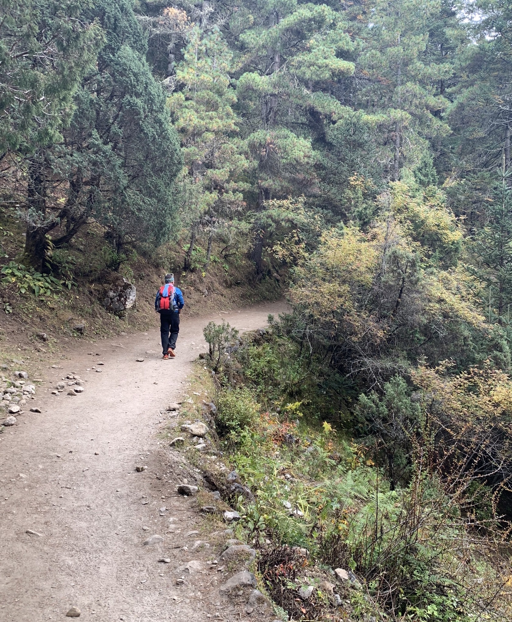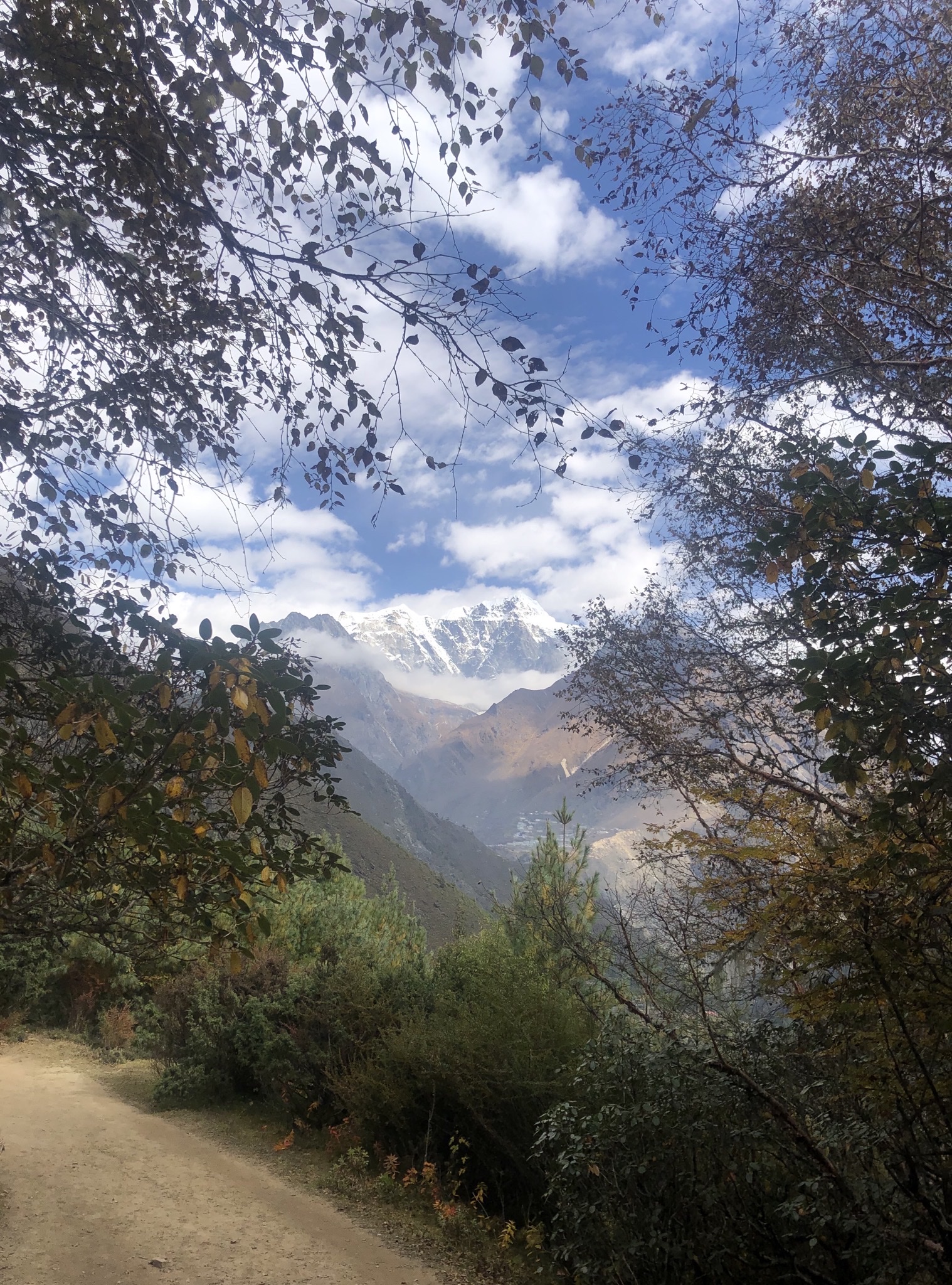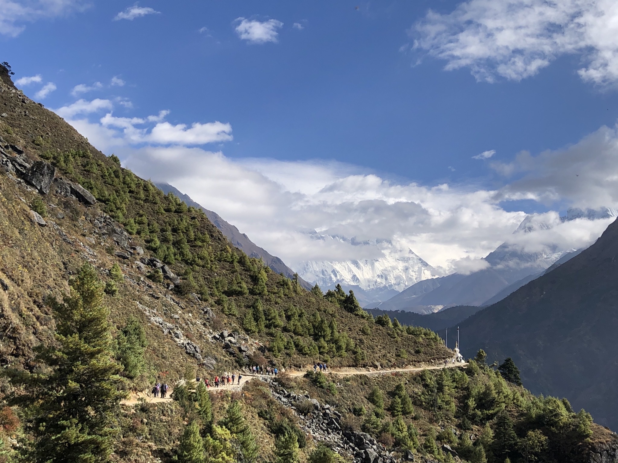 Perjalanan ke Tyangboche, diawali jalan datar, melingkar-lingkar melewati lereng-lereng gunung. Kembali pemandangan alam terbentang, dengan beberapa titik tikungan lereng berdiri megah stupa. Beberapa titik menyajikan pemandangan yang sulit diungkap dengan kata-kata. (Kata-kata memang tak akan pernah sanggup mengungkapkannya, paduan warna-warni, langit awan gunung, bukit lembah jurang, jembatan sungai air, manusia hewan tanaman, mata telinga hidung.)