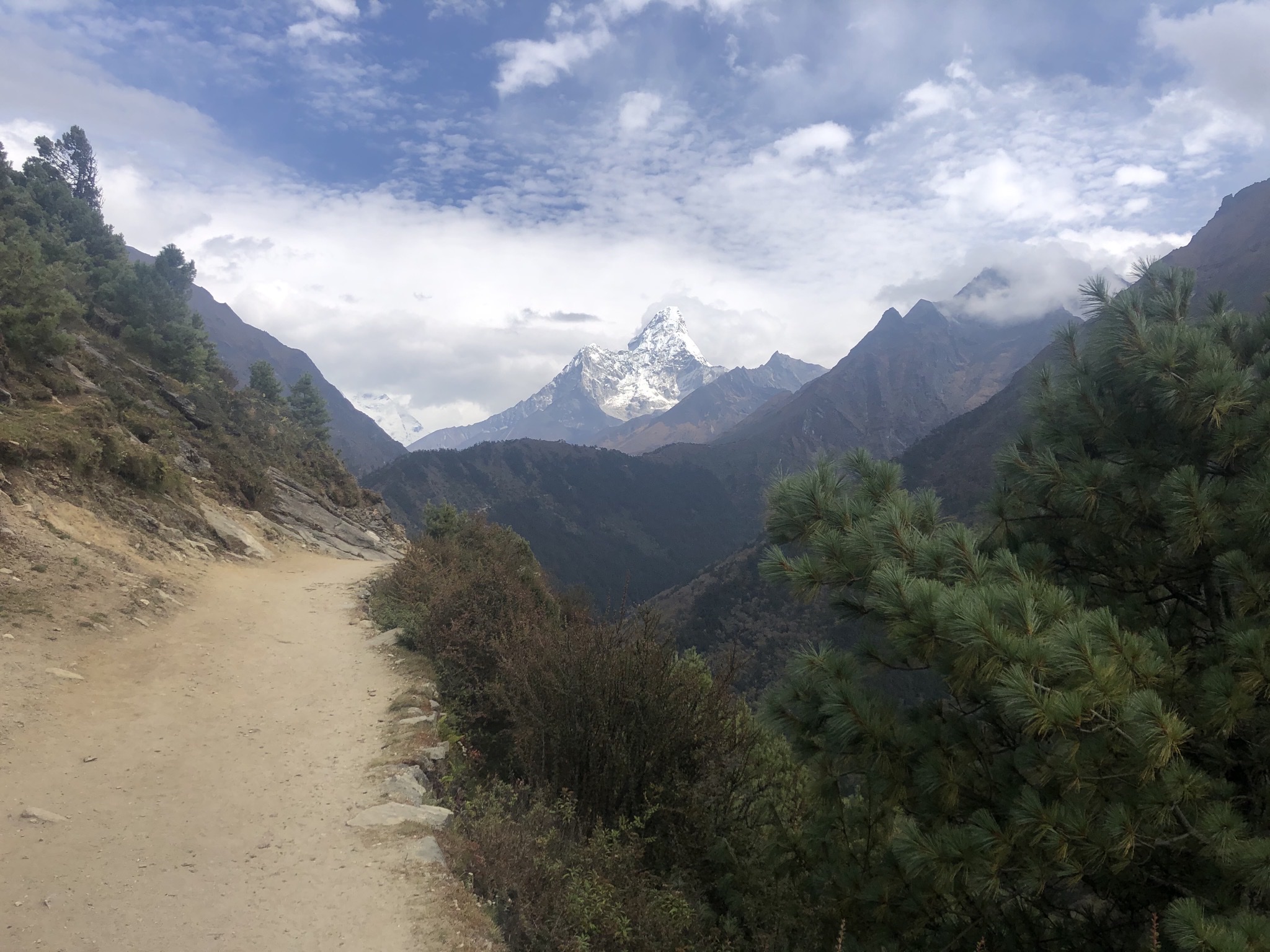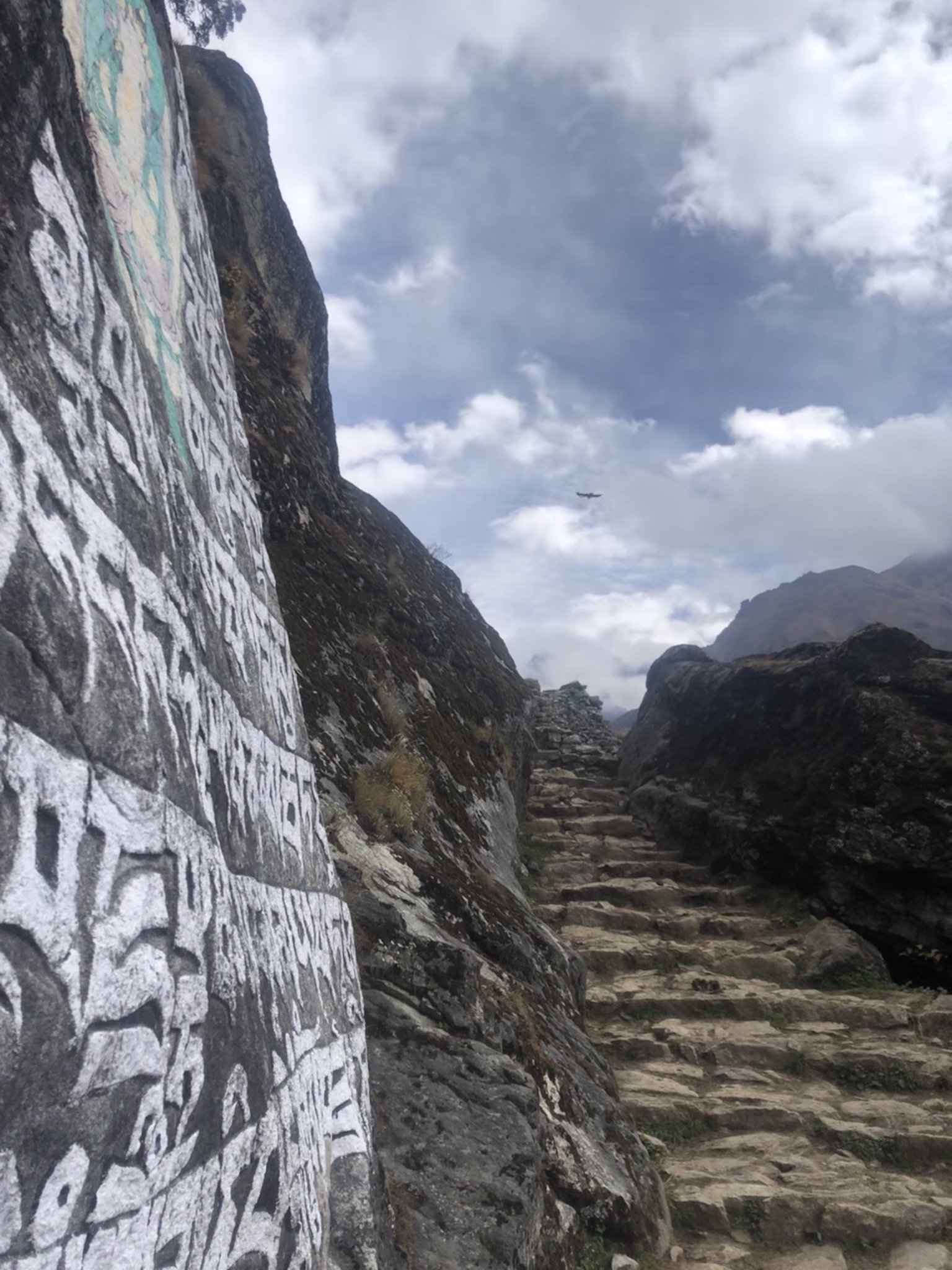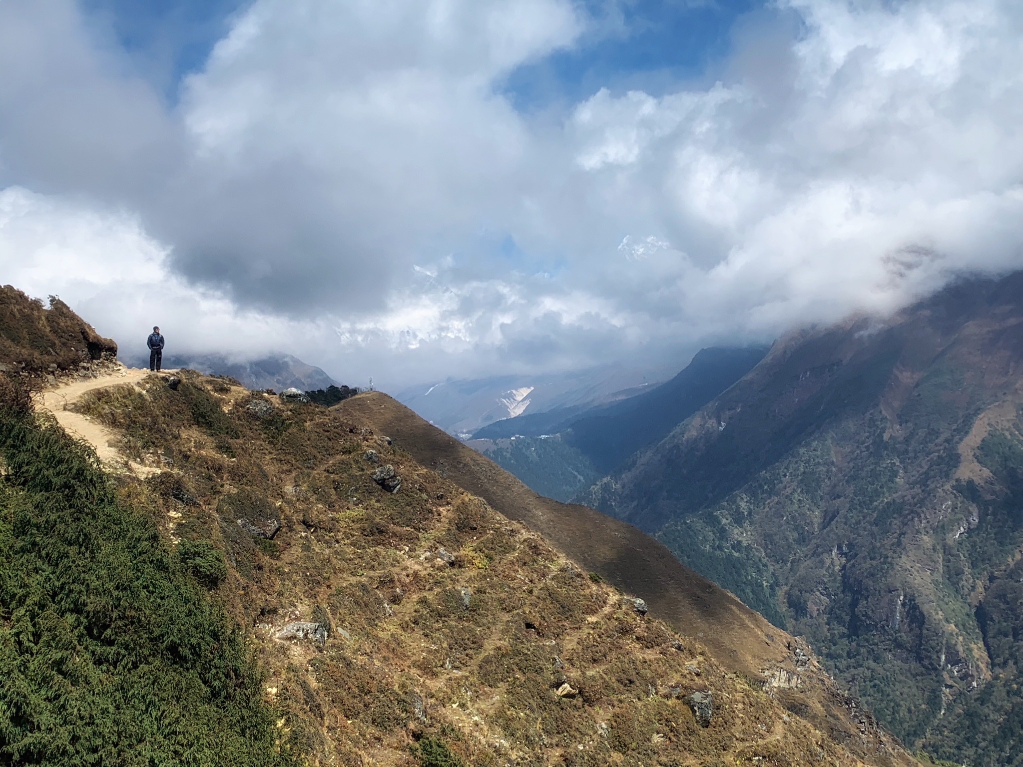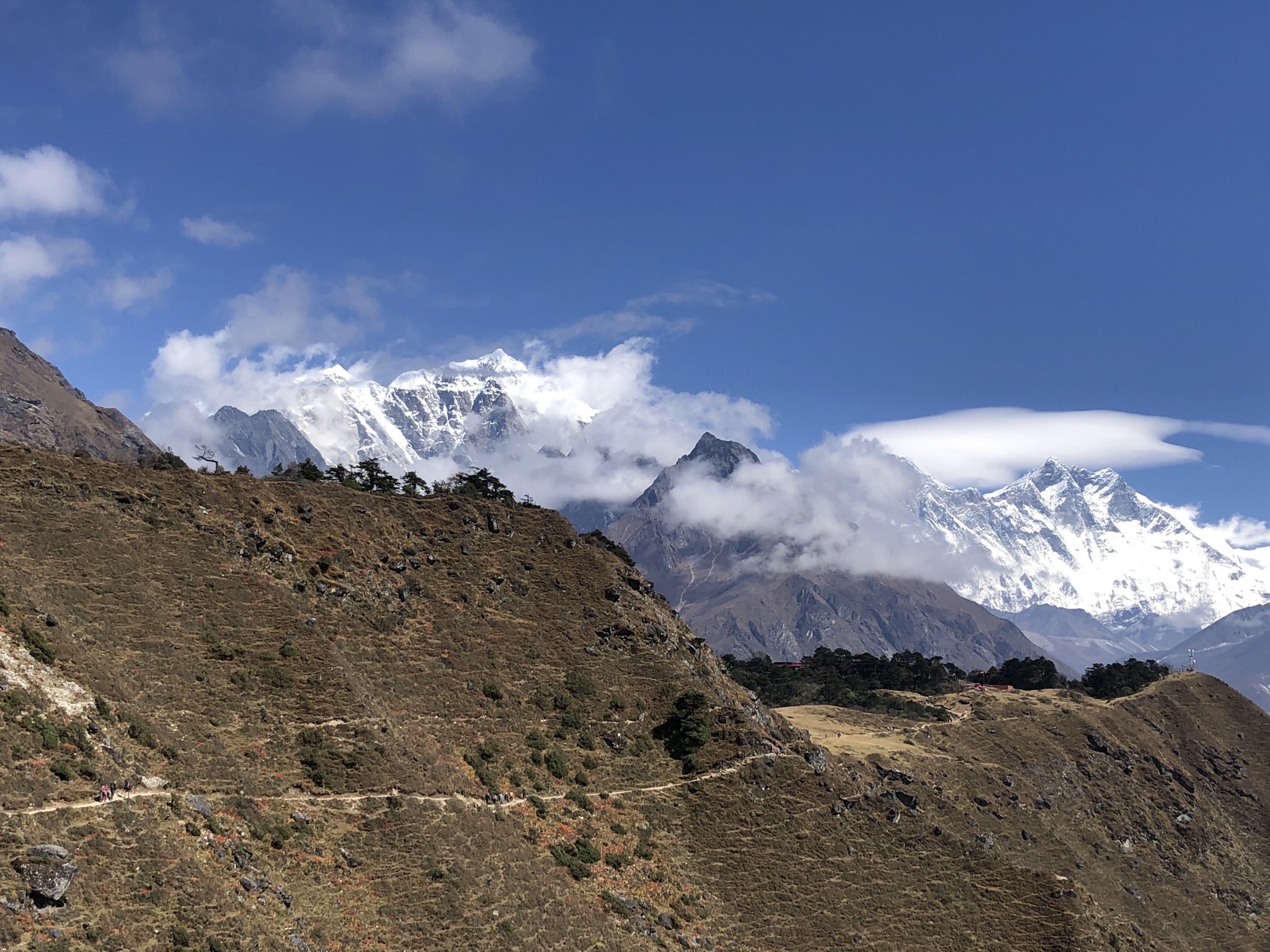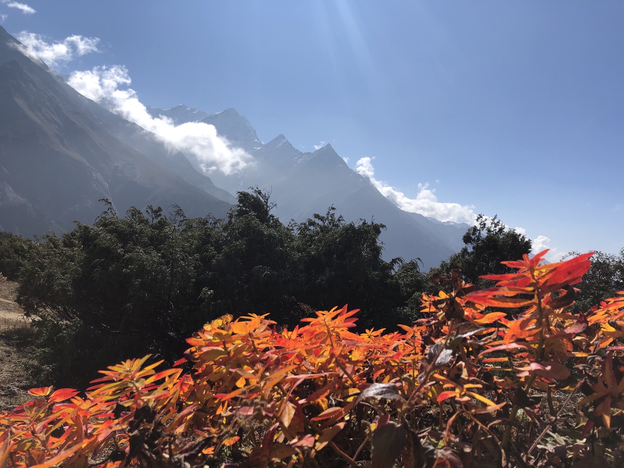 Perjalanan ke Tyangboche, diawali jalan datar, melingkar-lingkar melewati lereng-lereng gunung. Kembali pemandangan alam terbentang, dengan beberapa titik tikungan lereng berdiri megah stupa. Beberapa titik menyajikan pemandangan yang sulit diungkap dengan kata-kata. (Kata-kata memang tak akan pernah sanggup mengungkapkannya, paduan warna-warni, langit awan gunung, bukit lembah jurang, jembatan sungai air, manusia hewan tanaman, mata telinga hidung.)