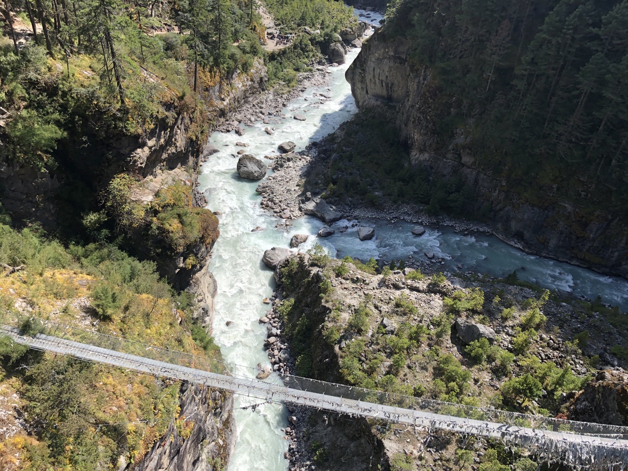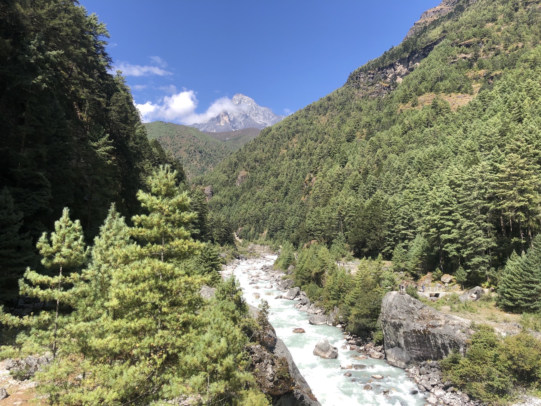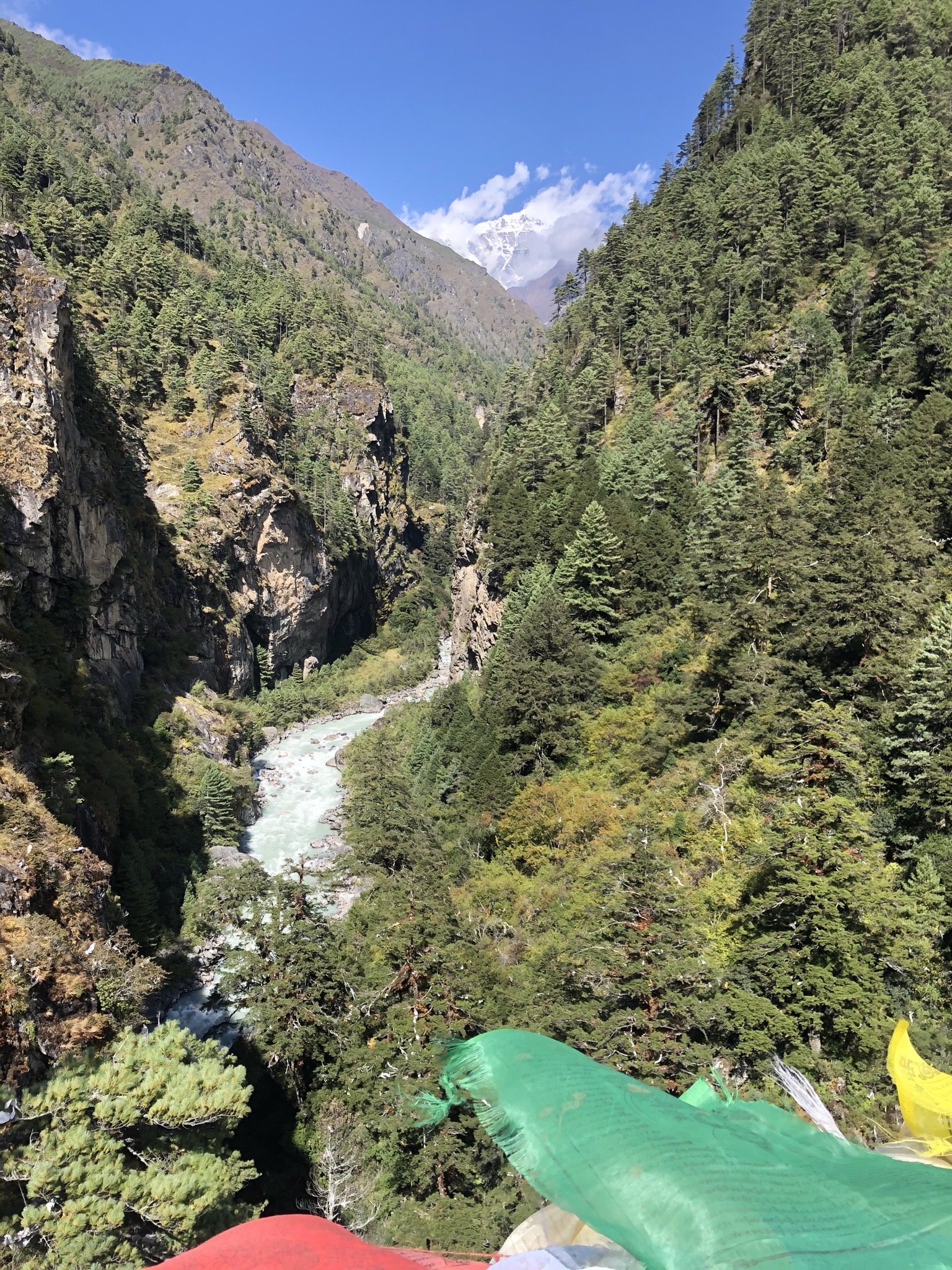 Jalan kemudian menurun menuju sungai, tempat makan siang, river side. Kepala mulai bingung untuk menu, pilihan kembali ke mie kuah Korea dan nasi putih. Plus cabe rawit yang horror itu. Ada turunan, ada tanjakan. Itu menu setelah makan siang. Lumayan, kombinasi dari mie-nasi-cabe, cukup untuk mengangkat tubuh hingga ke ketinggian 3.876 mdpl, Tyangboche!