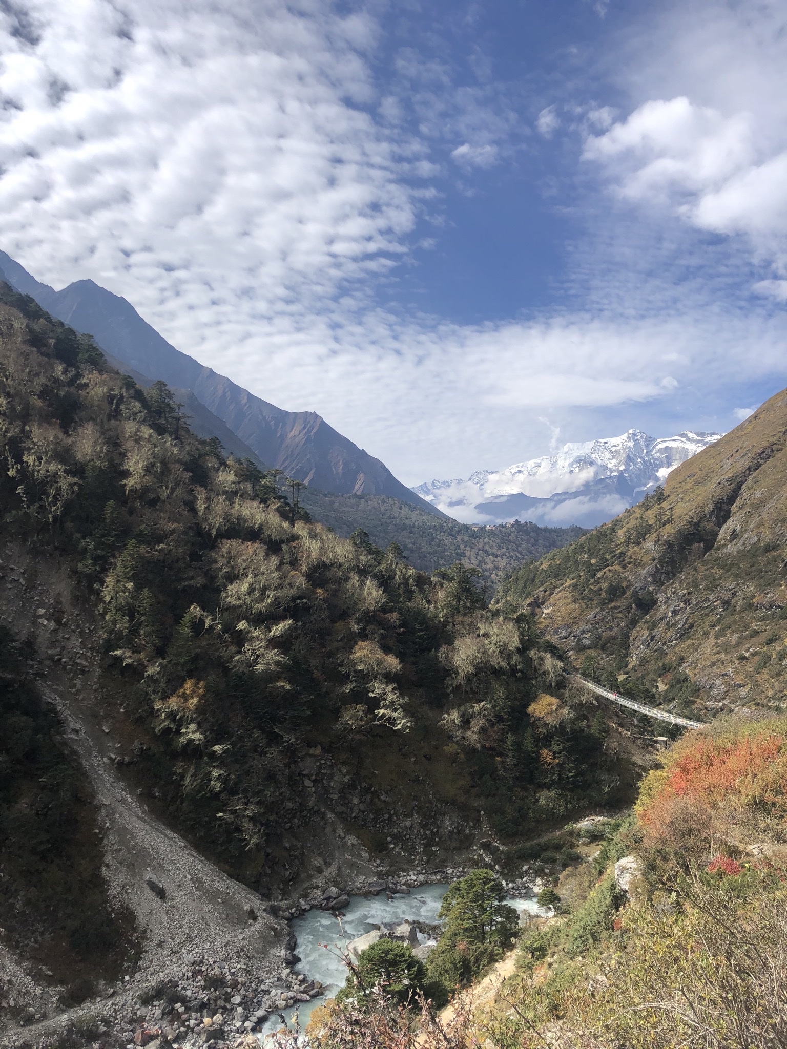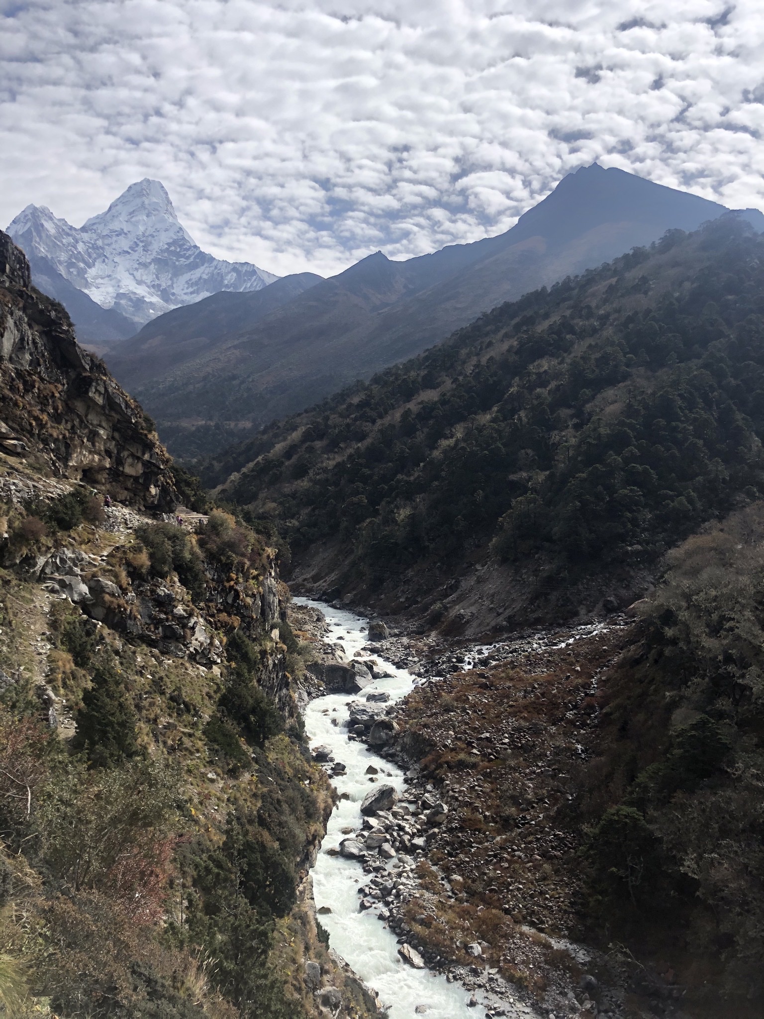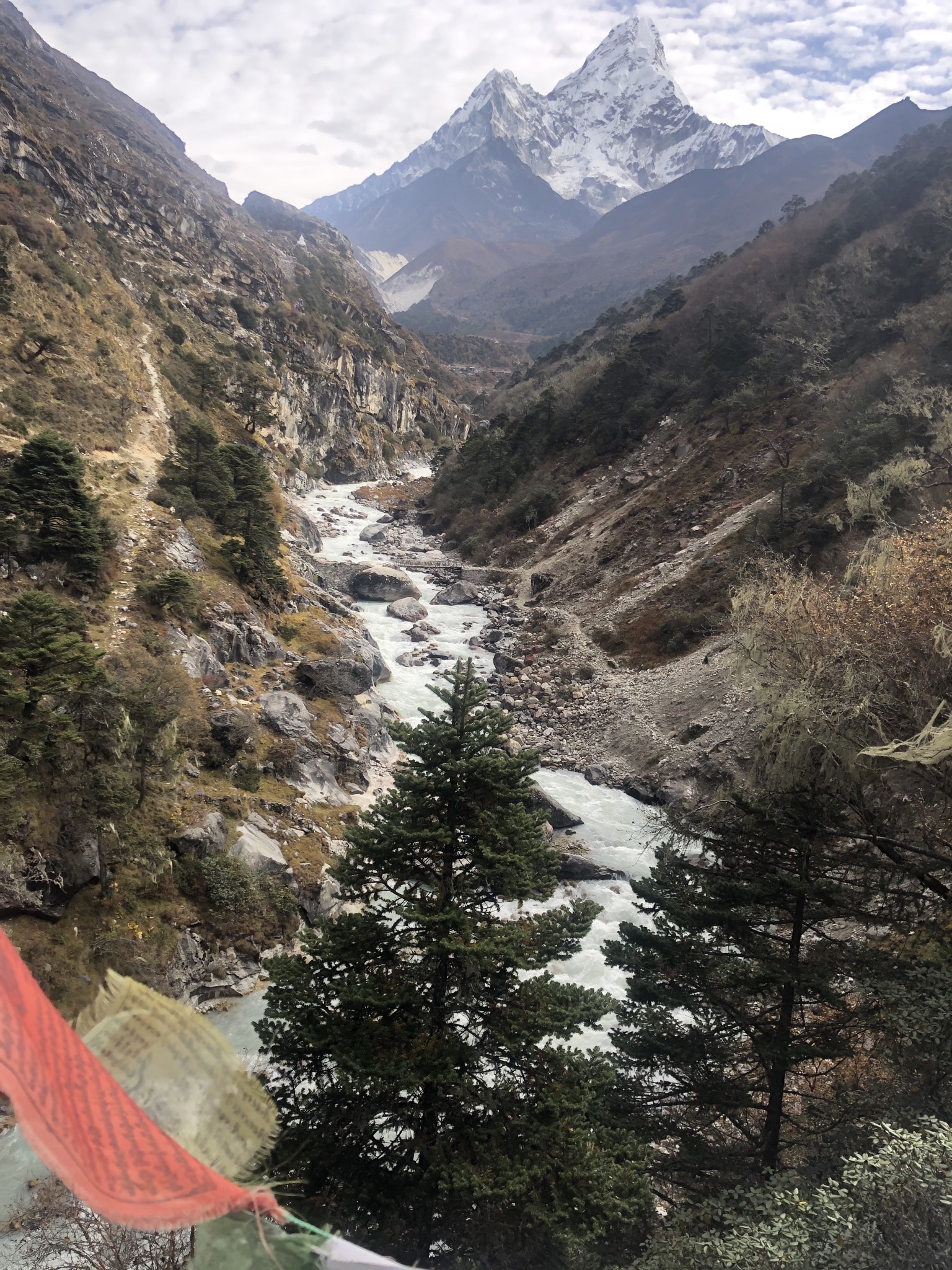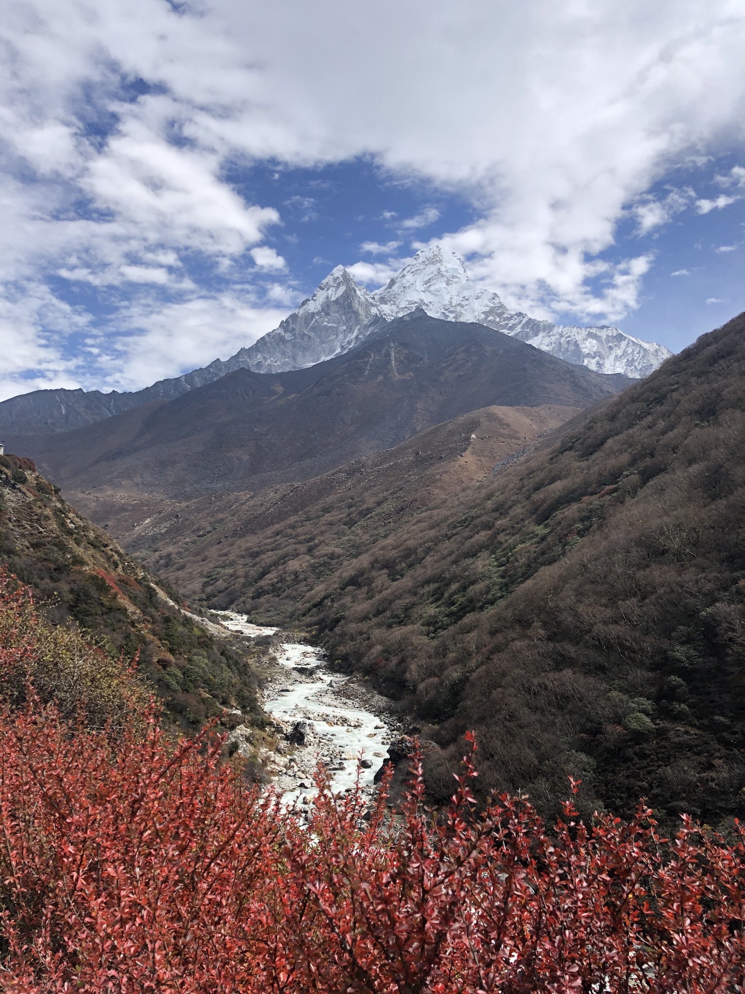 Angin dingin lereng membelai pipi, suara aliran sungai meliuk-liuk di telinga, tanaman warna-warni memanjakan mata, dan puncak Ama Dablam bersalju kokoh berdiri. Sekali lagi, sebuah lukisan tanpa perlu kata-kata.