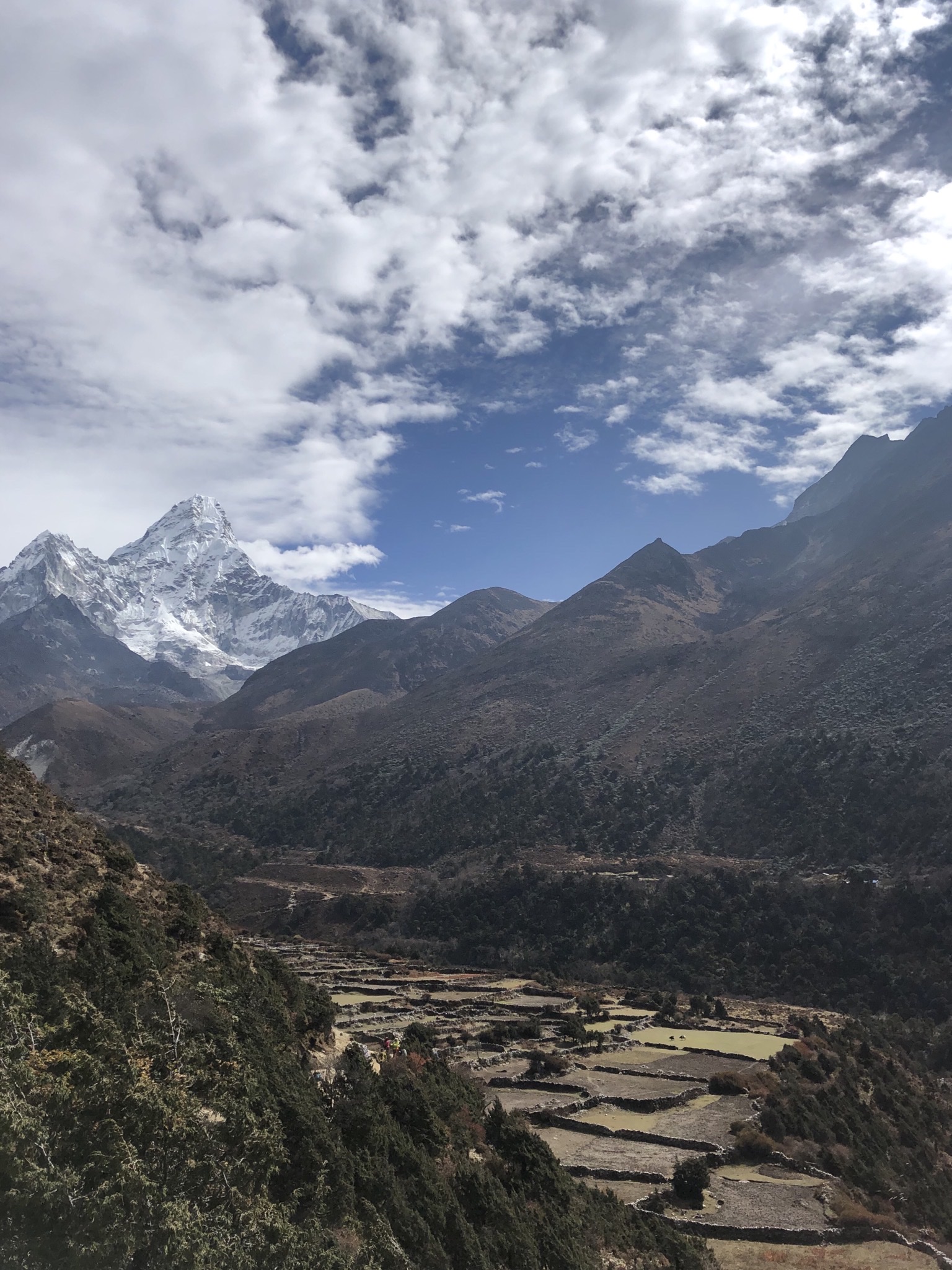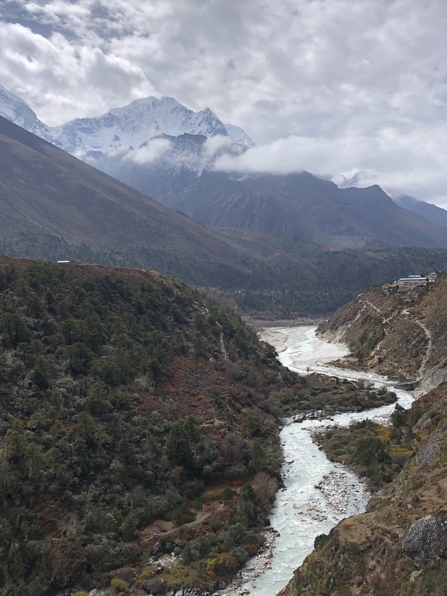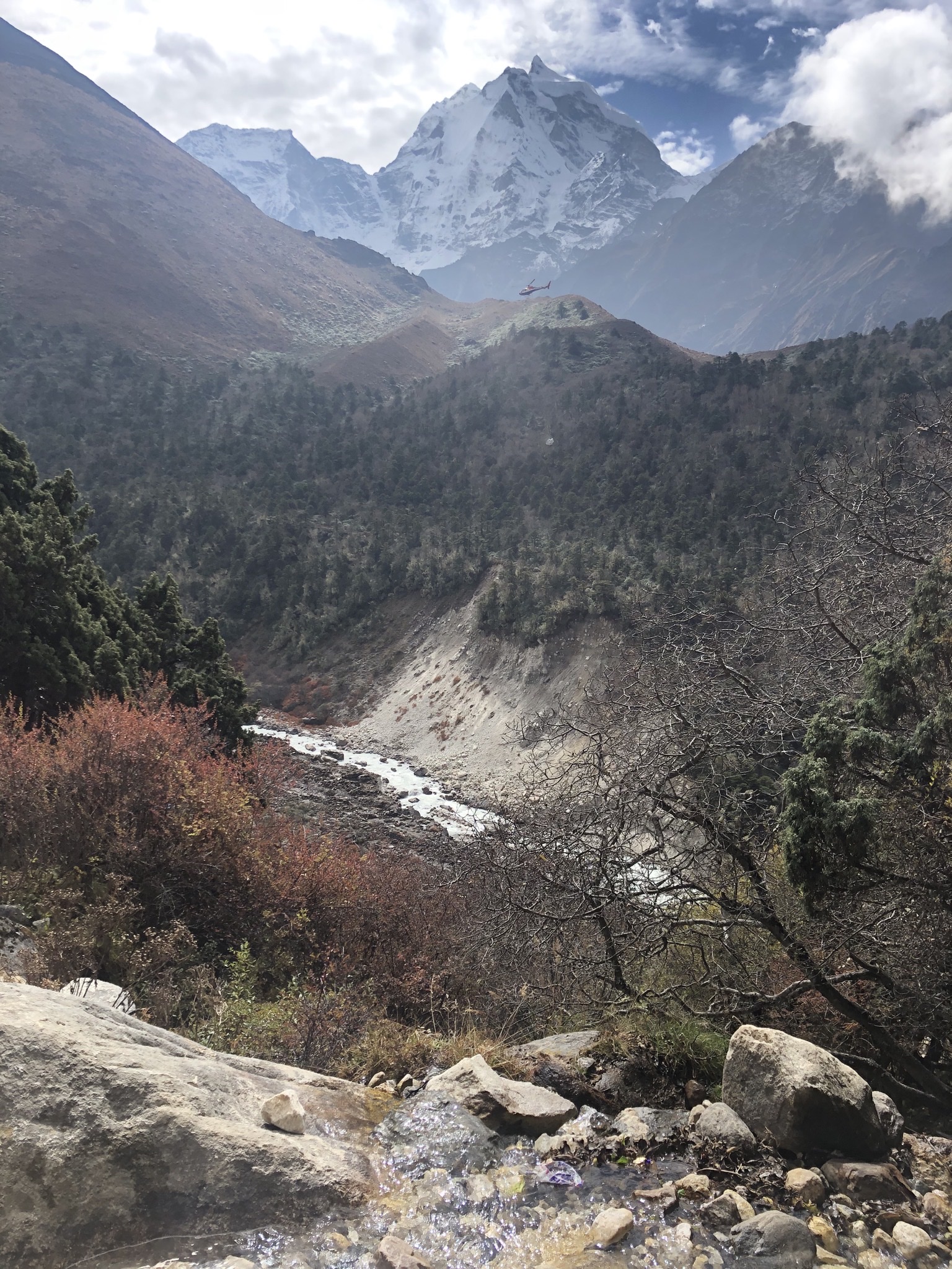 Angin dingin lereng membelai pipi, suara aliran sungai meliuk-liuk di telinga, tanaman warna-warni memanjakan mata, dan puncak Ama Dablam bersalju kokoh berdiri. Sekali lagi, sebuah lukisan tanpa perlu kata-kata.