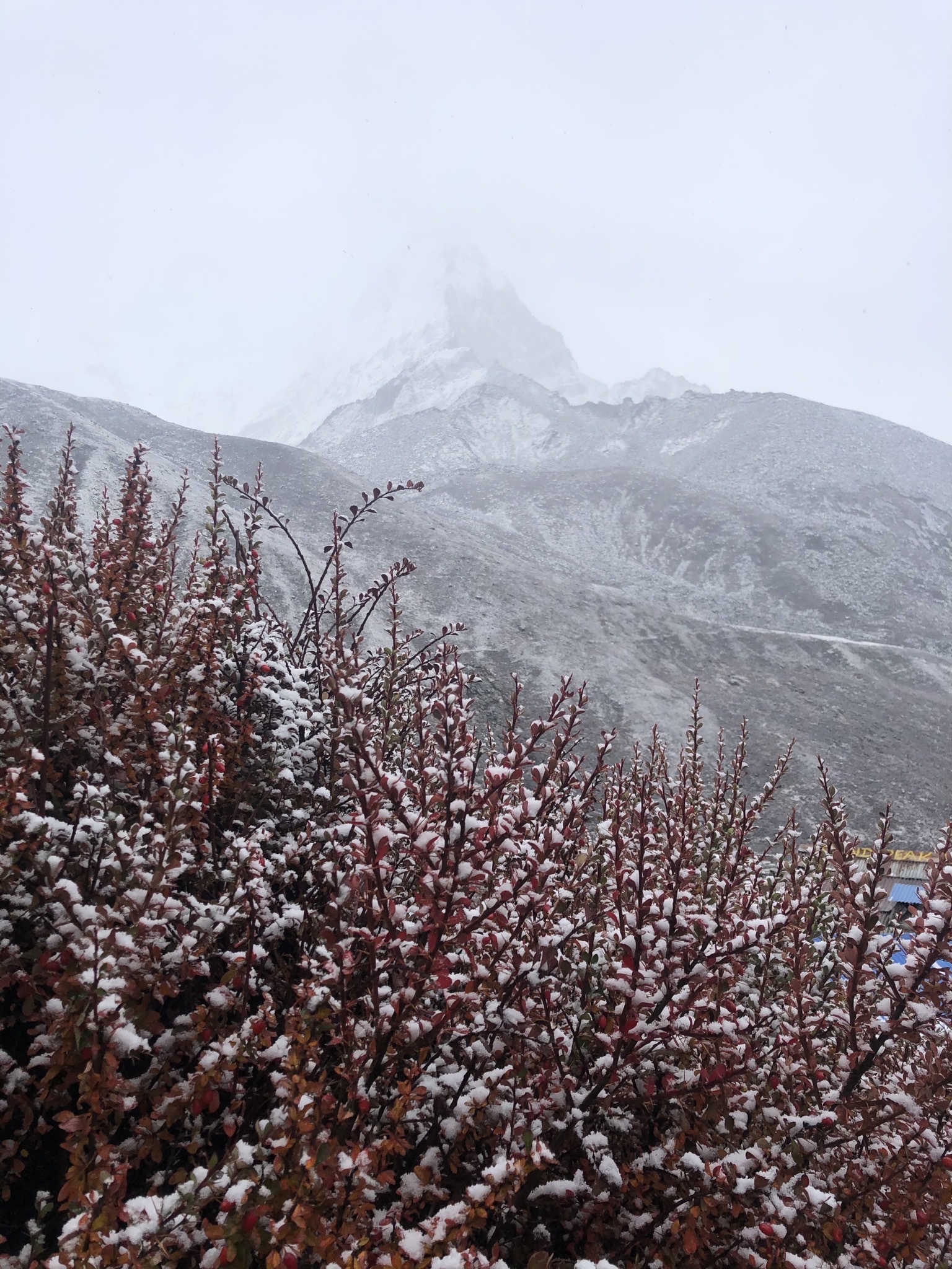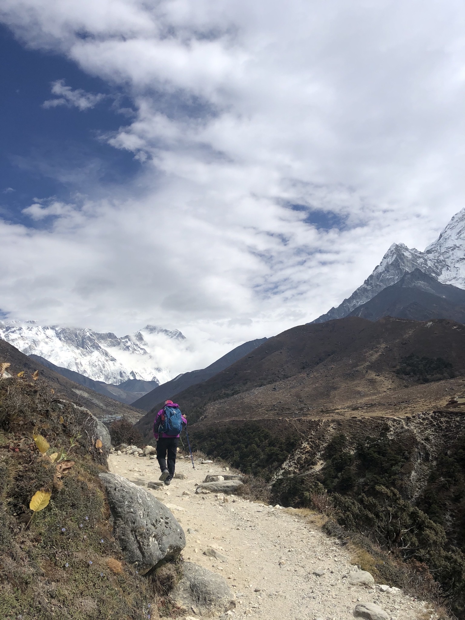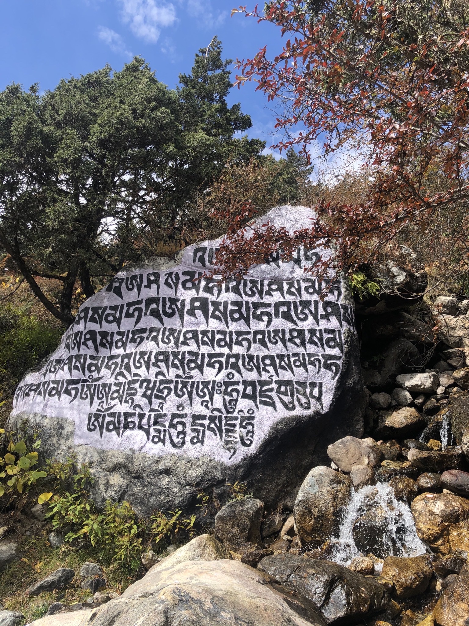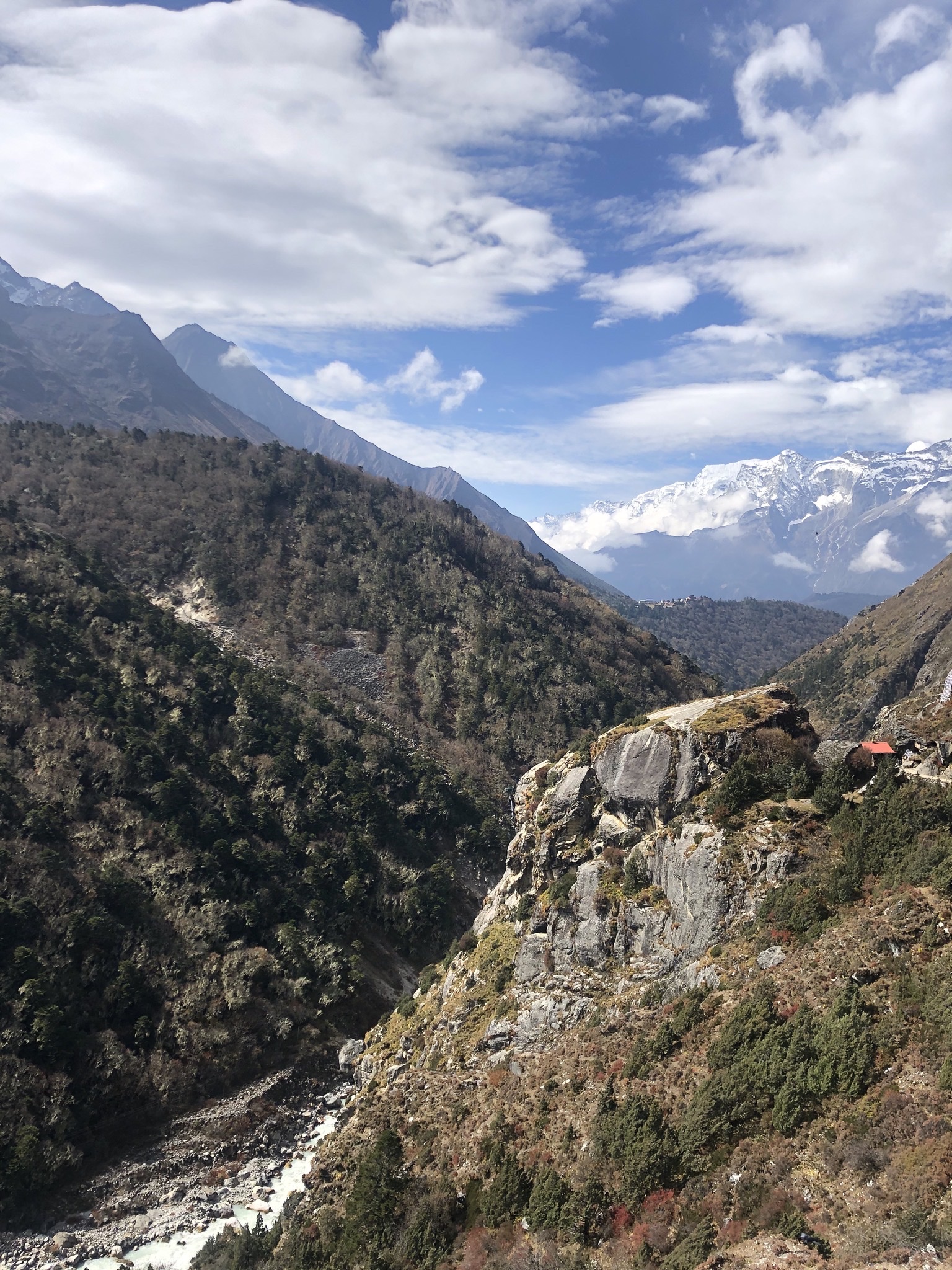 Angin dingin lereng membelai pipi, suara aliran sungai meliuk-liuk di telinga, tanaman warna-warni memanjakan mata, dan puncak Ama Dablam bersalju kokoh berdiri. Sekali lagi, sebuah lukisan tanpa perlu kata-kata.