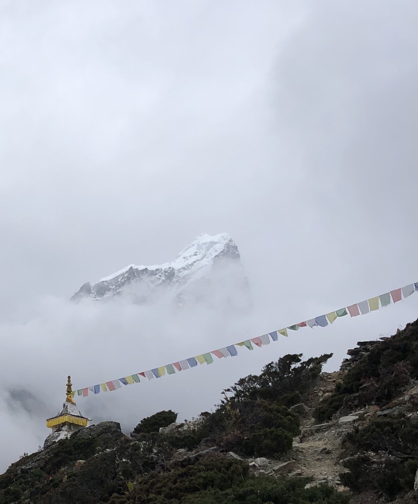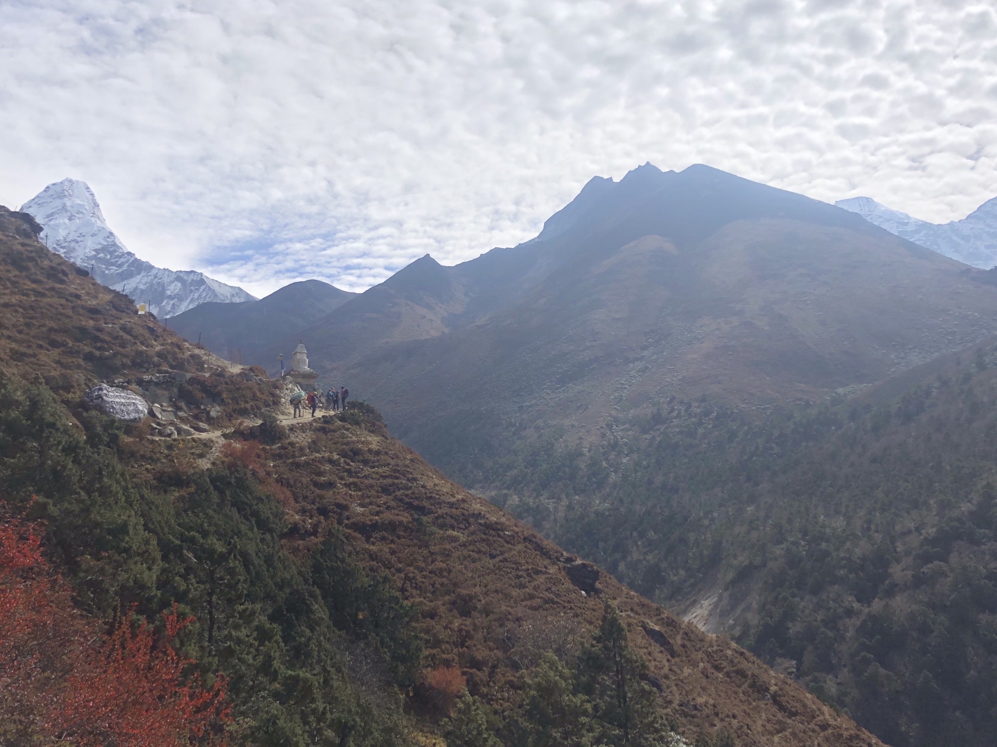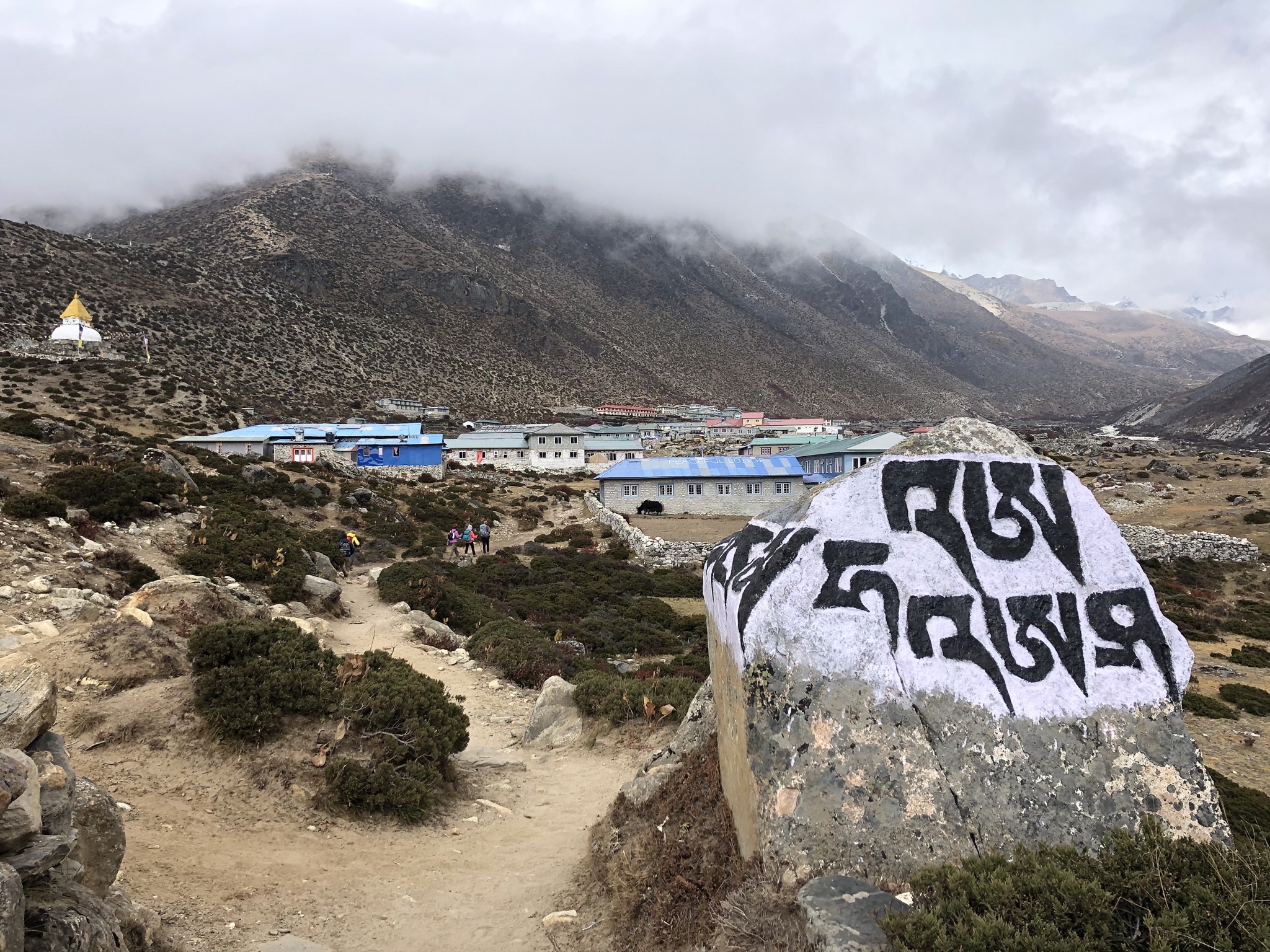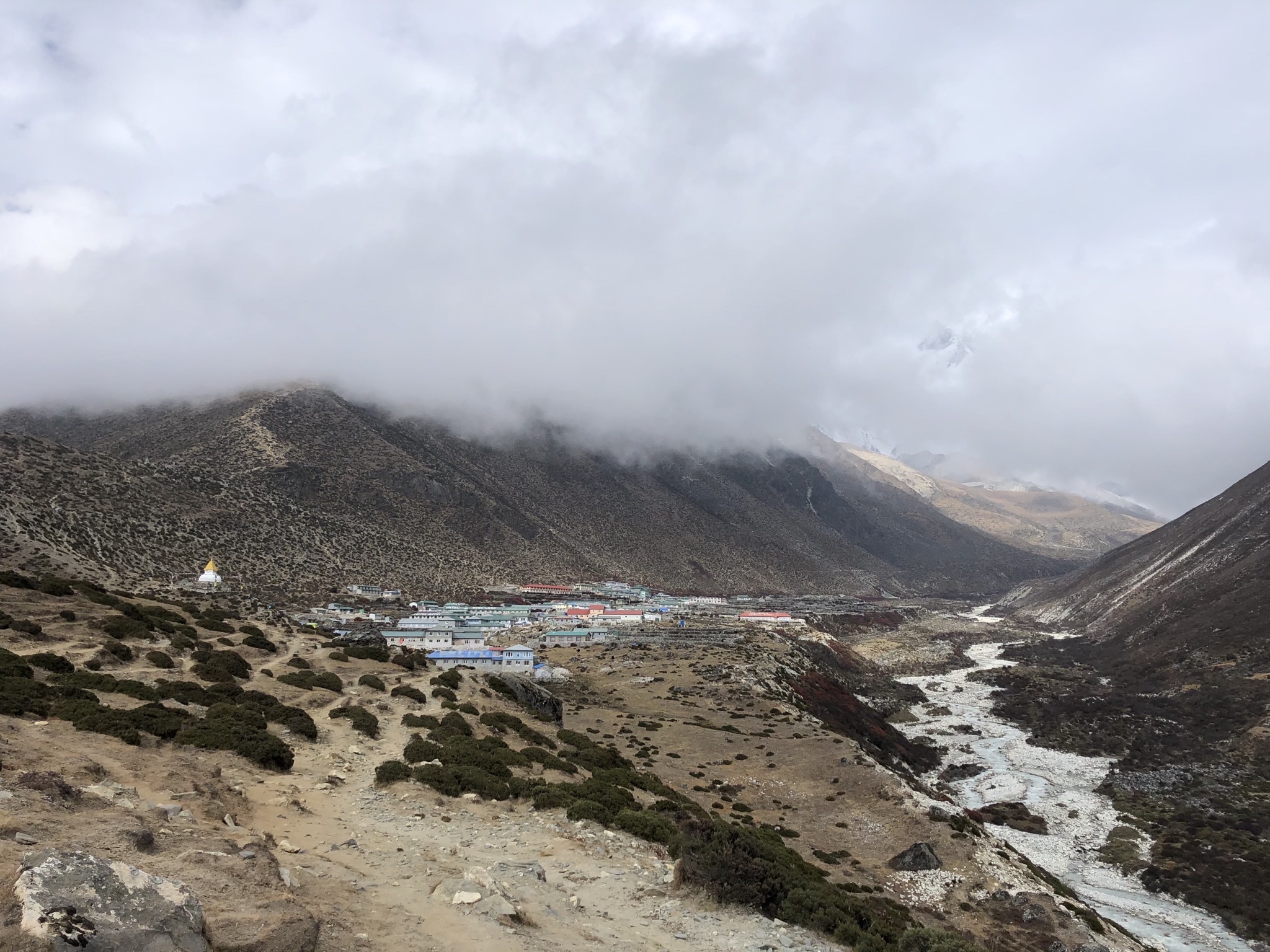 Sampai akhirnya terlihat sebuah stupa besar di sisi kiri serta deretan bangunan beratap biru dan merah di sisi kanan. Bisa jadi itulah desa tertinggi dan terakhir di jalur sepanjang EBC, dengan warga pemukimnya.