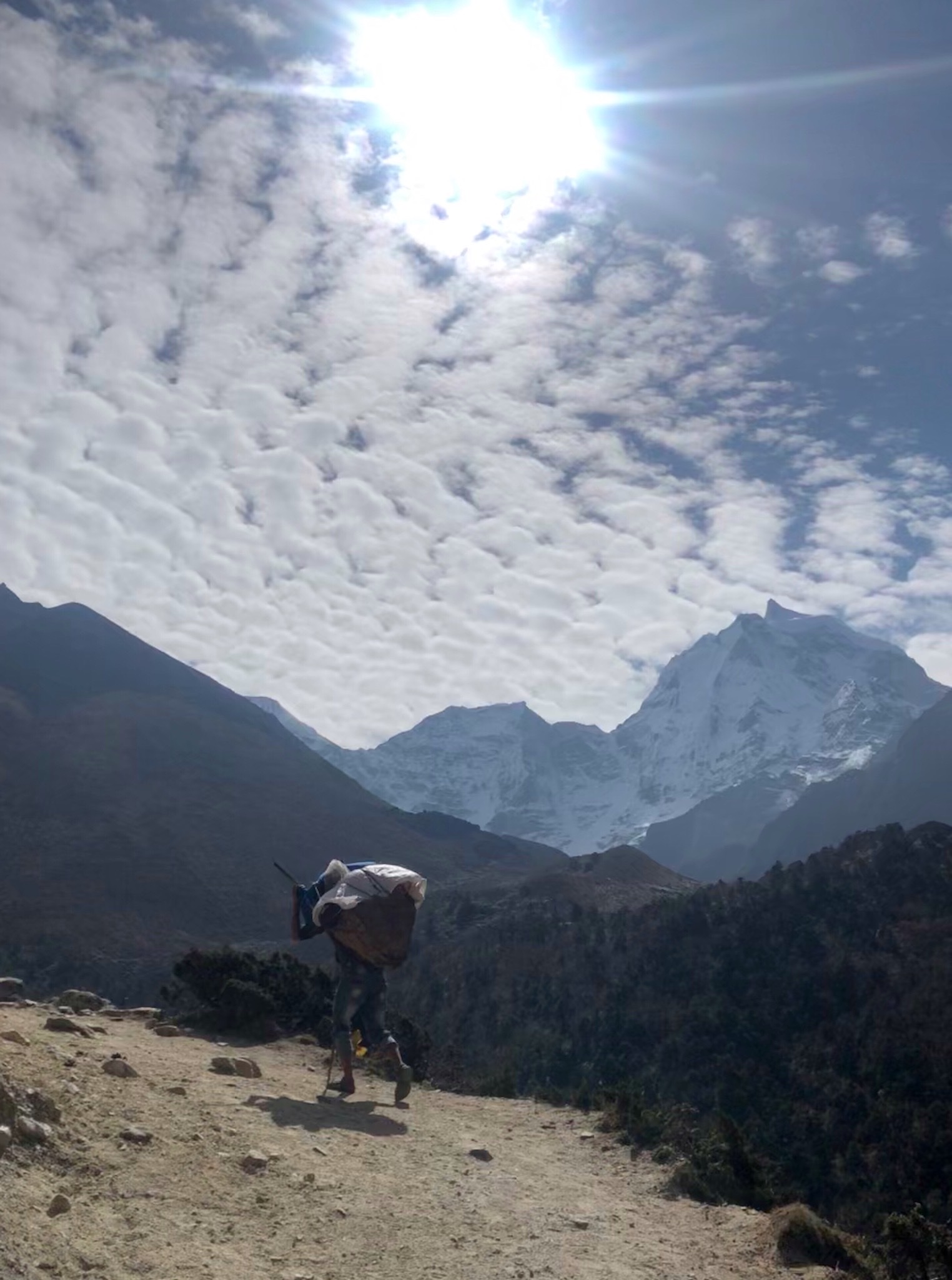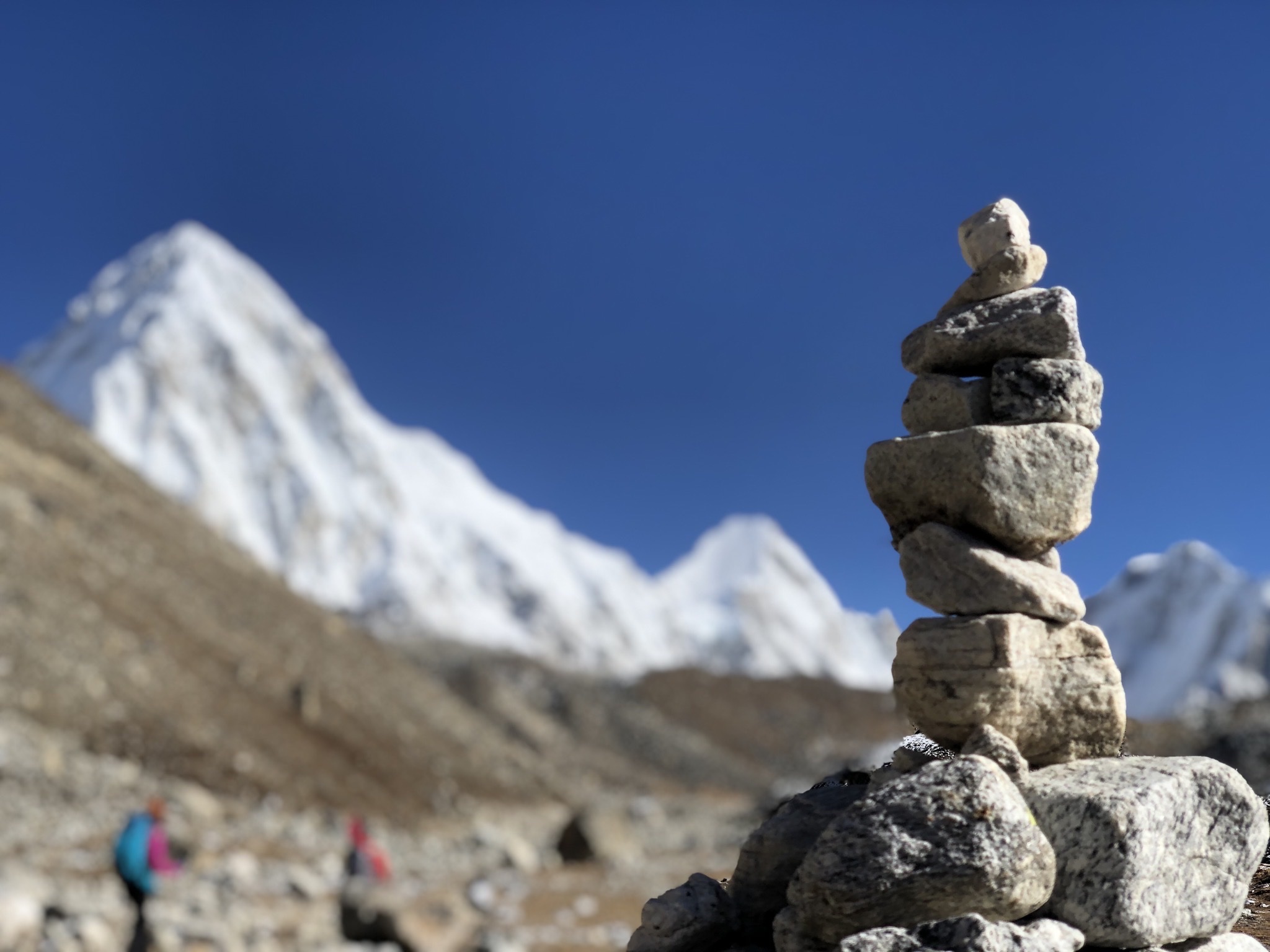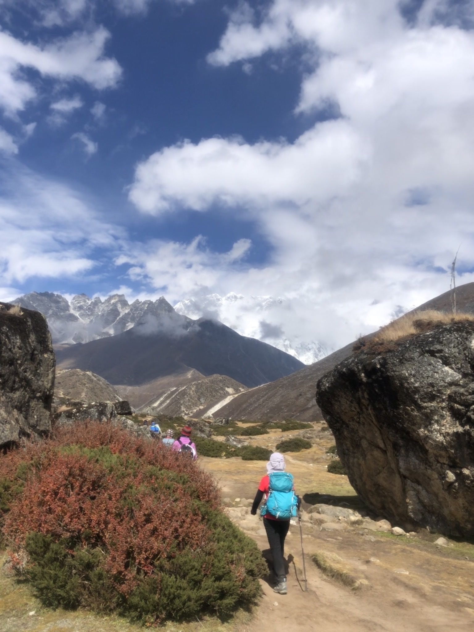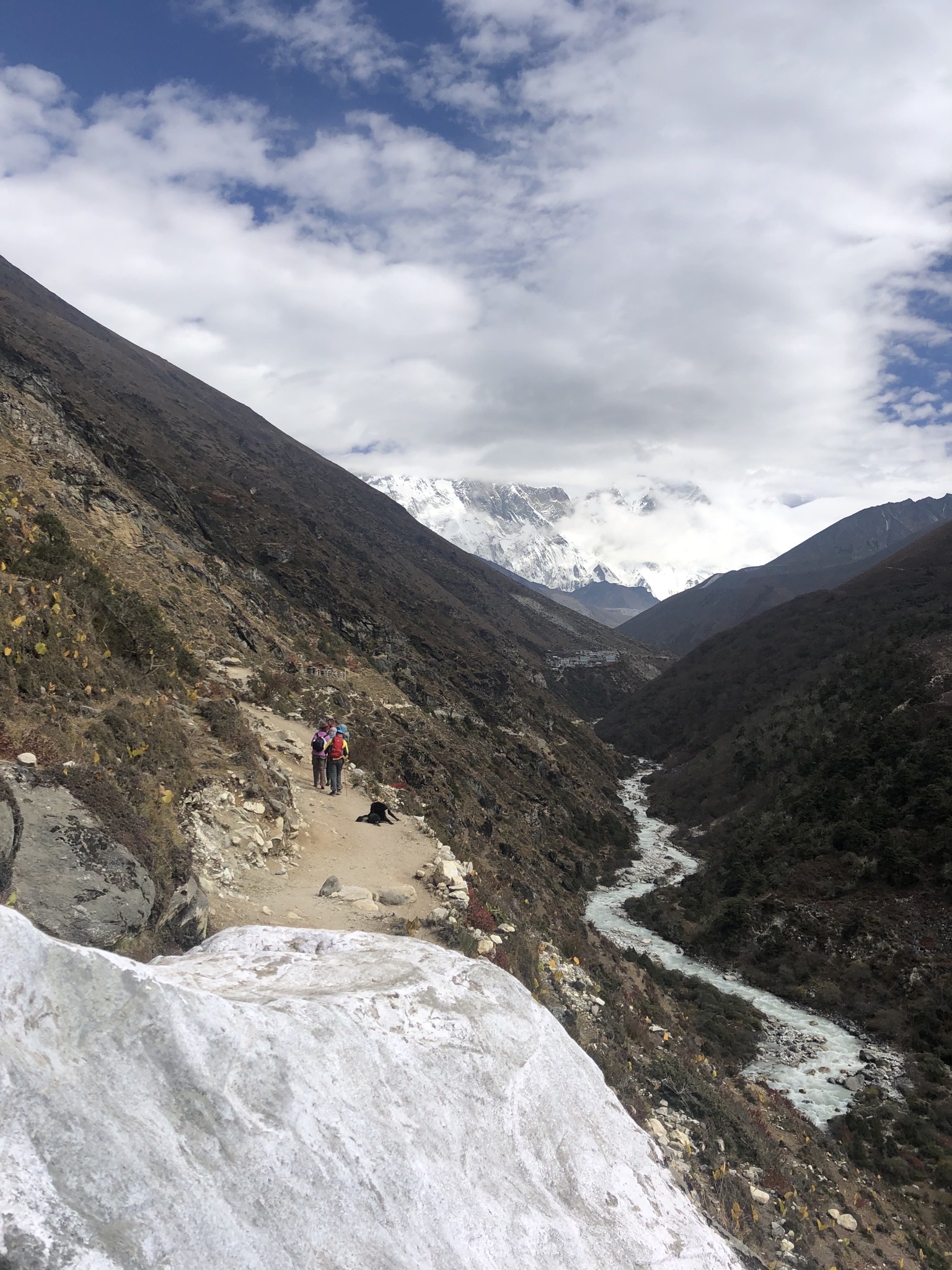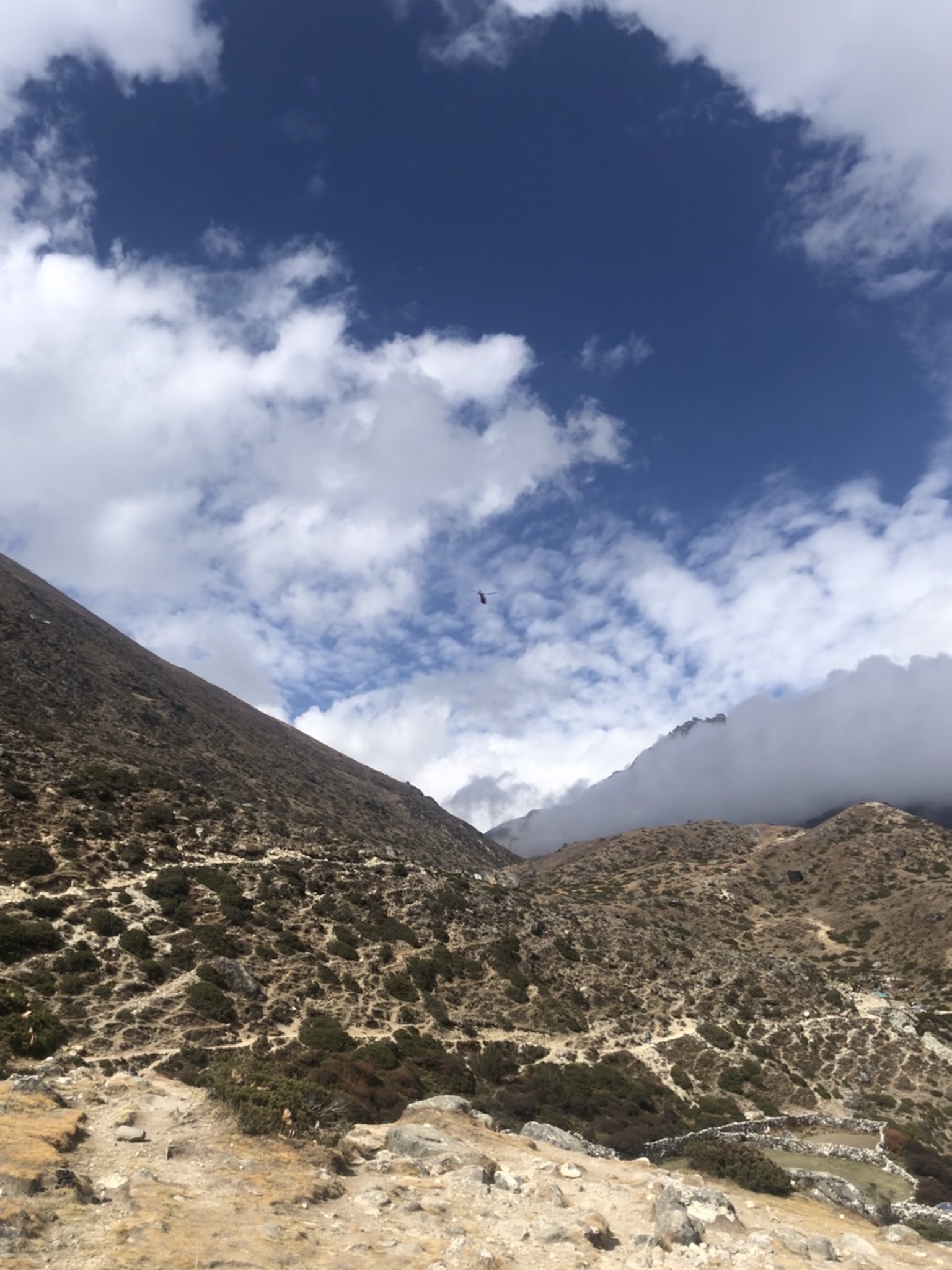 Sampai akhirnya terlihat sebuah stupa besar di sisi kiri serta deretan bangunan beratap biru dan merah di sisi kanan. Bisa jadi itulah desa tertinggi dan terakhir di jalur sepanjang EBC, dengan warga pemukimnya.