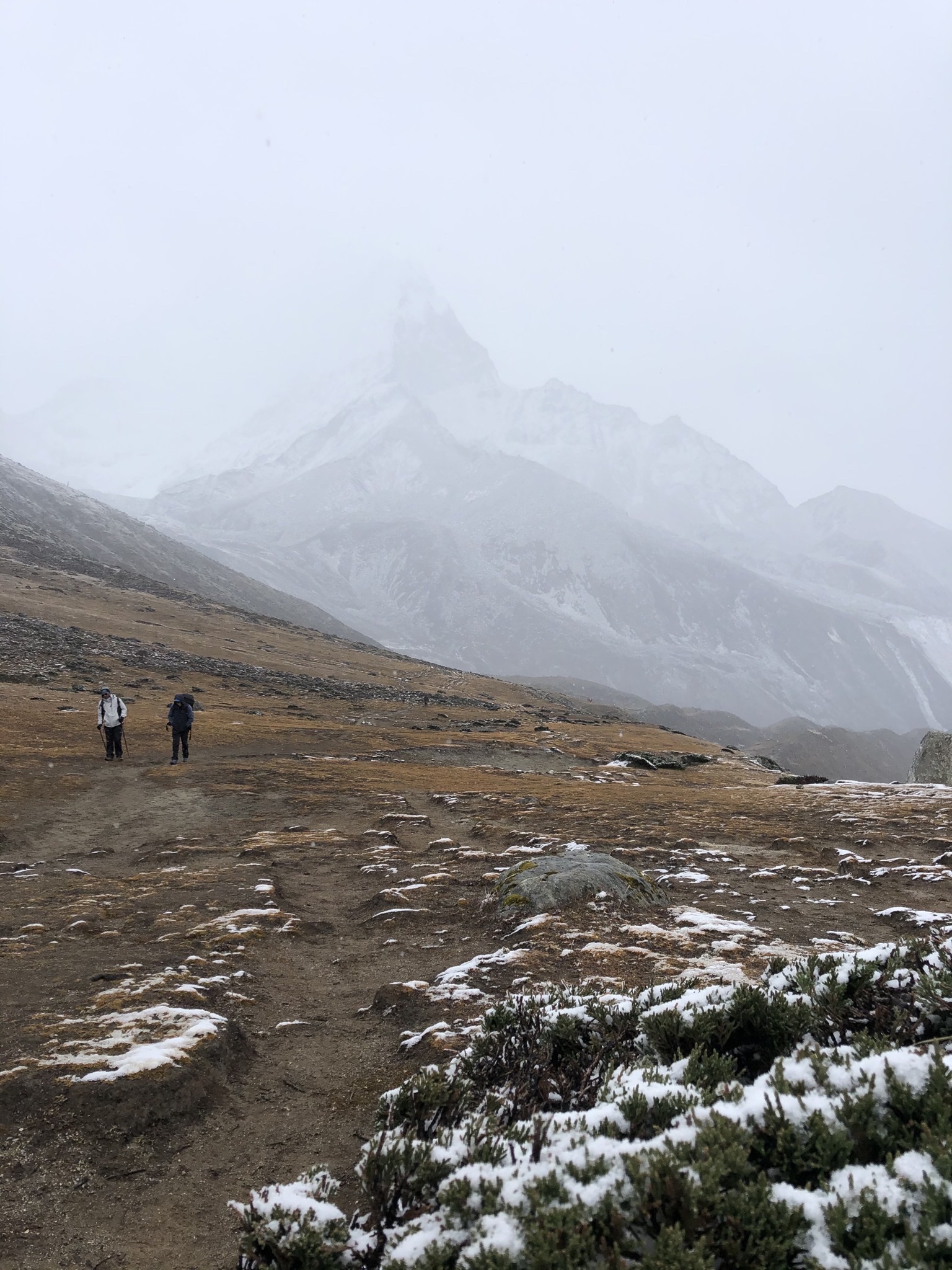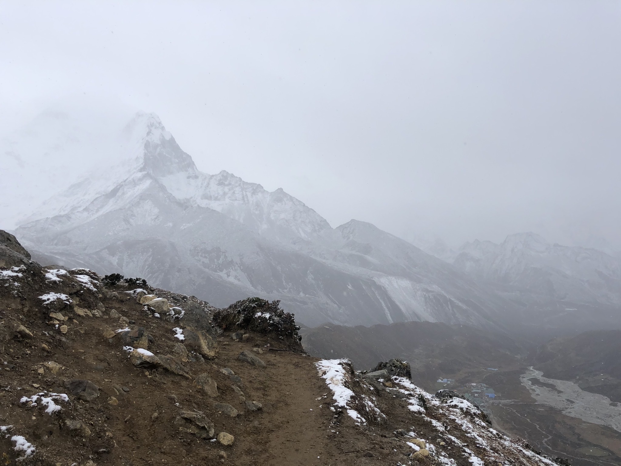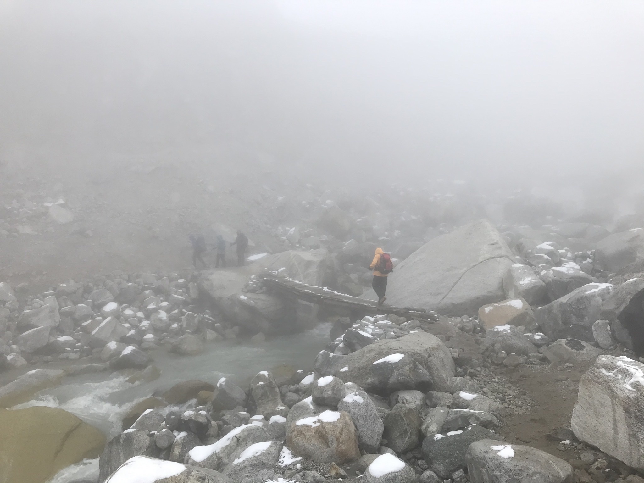 Sebelum akhirnya dikepung kabut tebal, memasuki jalan bebatuan, turun menyeberangi sepotong jembatan pendek, mendaki kembali untuk makan siang di sebuah perhentian. Tanpa selera, butuh kehangatan, hanya ingin segera mencapai titik berikutnya, Lobuche.