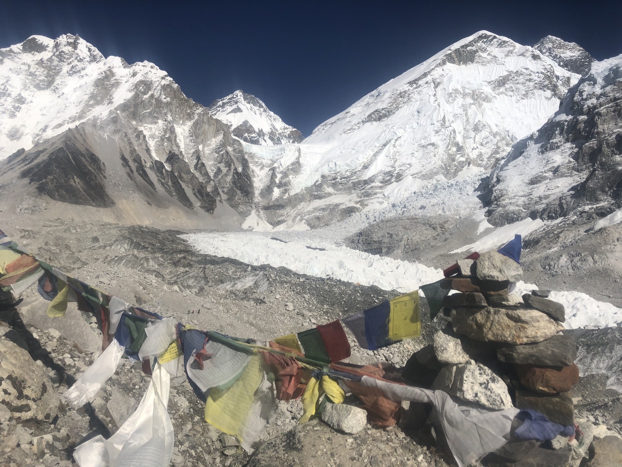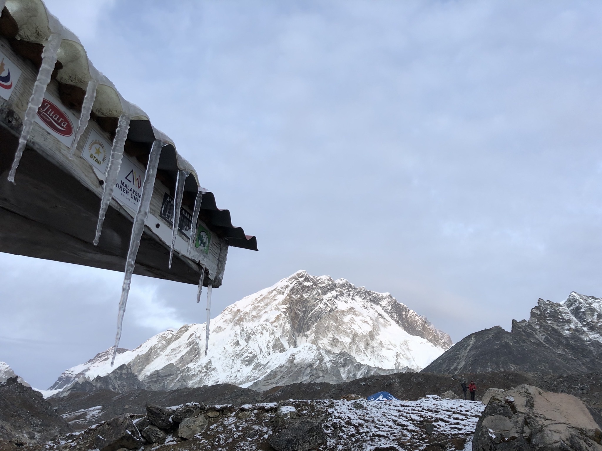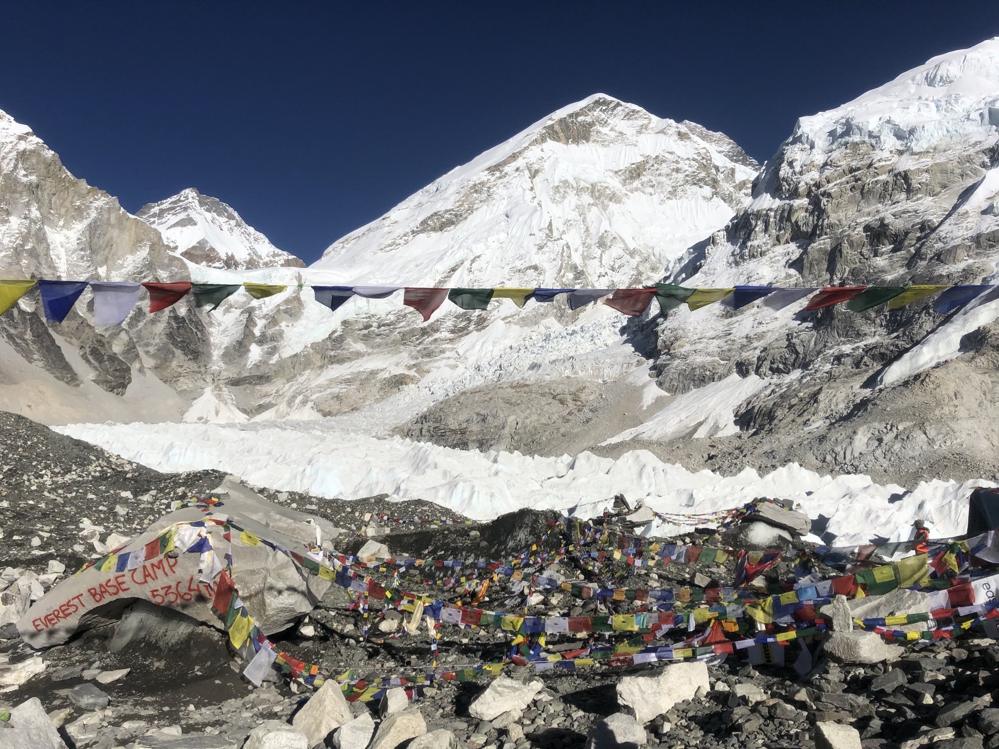 Yang ditandai dengan bendera-bendera kecil warna-warni yang berkibar-kibar dan sebuah batu besar yang ditulis merah, “Everest Base Camp 5364m”. Hanya itu.