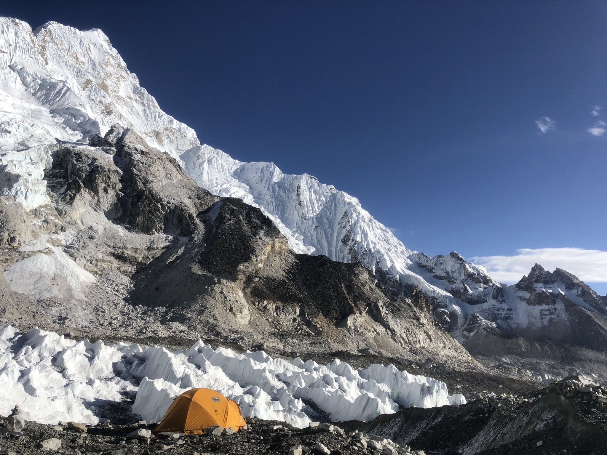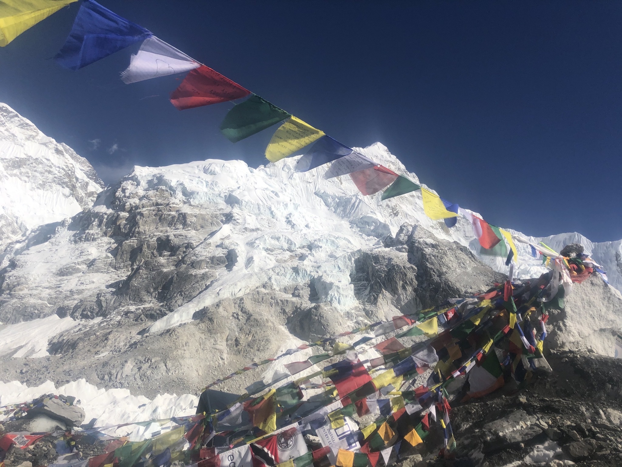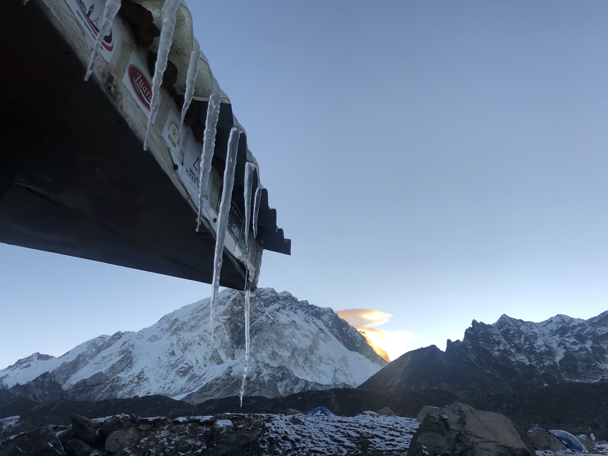 Yang ditandai dengan bendera-bendera kecil warna-warni yang berkibar-kibar dan sebuah batu besar yang ditulis merah, “Everest Base Camp 5364m”. Hanya itu.