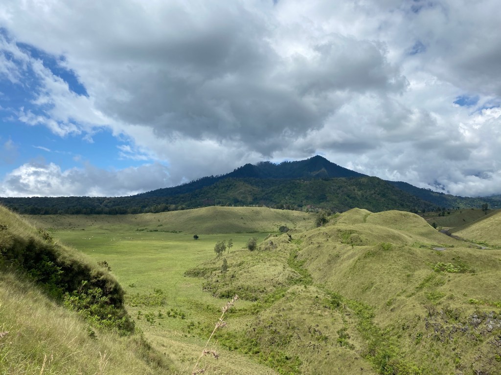 Tujuan berikutnya adalah kembali mendaki ke atas, ketinggian 1.500 mdpl, Kawah Wurung (ya, urung, gak jadi, makanya di puncaknya tidak ada kawah). Tetapi keindahannya sama sekali tidak urung; bayangkan keindahan hamparan pegunungan Alpen di Swiss seperti dalam film The Sound of Music -minus puncak gunung bersalju- lengkap dengan domba-domba seperti noktah-noktah putih nun jauh di bawah sana yang tengah menikmati rumput hijau. Lekuk-lekuk alam berlapis-lapis sejauh mata memandang, tiga ratus enam puluh derajat, di antara ilalang-ilalang liar menjulang. Tidak bisa bersantai lama, apa boleh buat, durasi, perjalanan harus dilanjutkan, ke arah Kali Pait, air terjun belerang. Dan selanjutnya Paltuding, gerbang pendakian Kawah Ijen, tempat kami โdiserahterimakanโ, dari teman-teman pelari pendamping Bondowoso kepada teman-teman pelari pendamping Banyuwangi. (We said goodbye, we said hello, matur suwun, Rek!)