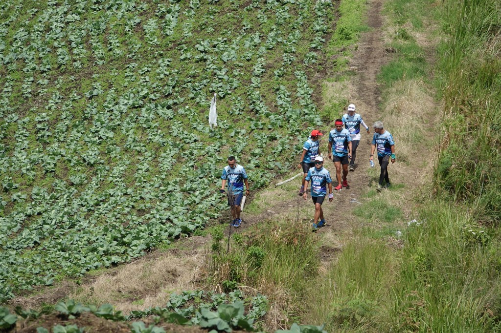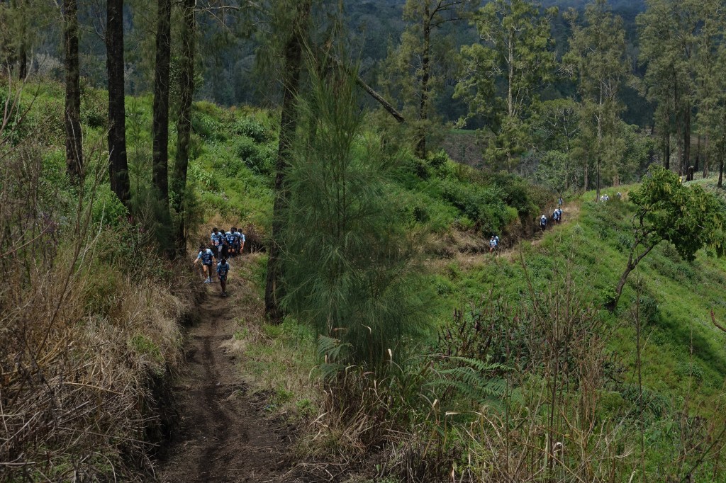 Dan sekali ini Ijen GeoParkRun menjadi unik, tidak melulu aspal. Setengahnya, etape pertama, sekitar 30K dari total sekitar 60K sebagian besar ditempuh melalui jalur trail; gunung dan hutan, batu pasir dan tanah hitam. Dilepas atraksi tarian sepasang singo ulung, pukul 06:19 pagi, mulai berlari melaju turun dari puncak Megasari di ketinggian 1.600 mdpl, menyusuri jalan setapak rimbun dan jurang di sisi kanan, dengan pemandangan gunung di kiri kanan tiada habisnya.