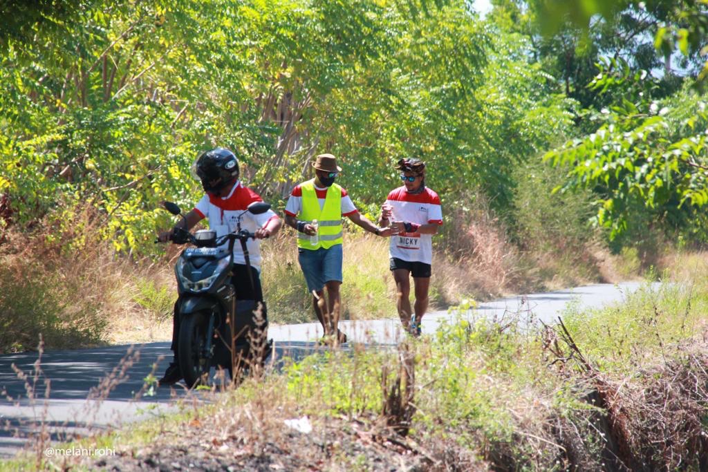 Sesekali aku harus mencari bidang tanah datar -dan rindang- di pinggir jalan aspal, untuk berhenti. Berdiri sejenak. Tidak mampu melangkah, hanya berharap dapat mengendurkan sedikit otot-otot paha dan betis yang terus mengeras. Lalu melanjutkan langkah dengan postur semakin membungkuk, kepala tertunduk dalam. Petugas fisio yang melintas, sempat menepi untuk memastikan kondisi baik-baik saja. Mungkin aku akan butuh bantuan mereka nanti di check point depan. Atau mungkin juga tidak. Aku sangat jarang atau nyaris tidak pernah berurusan serius dengan fisioterapis di setiap kegiatan lari jauh.