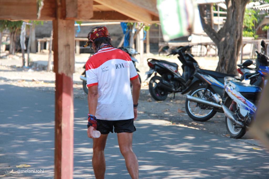 Hari sebelumnya, saat briefing, Lexi – Race Director sudah mengingatkan, lepas dari KM 27 adalah jalur menanjak, hingga ke check point kedua di KM 43. Ketika matahari mulai memanggang kepala, akhirnya berhadapan juga dengan kenyataan itu. Setelah separuh perjalanan menyusur garis pantai Laut Jawa di sisi utara pulau Lombok, jalanan mulai mengarah ke Senaru, kaki Gunung Rinjani. Menanjak dan hanya menanjak, kadang tanjakan landai kadang tanjakan curam, tetapi namanya tetap sama, tanjakan. Berjalan semakin tertatih.