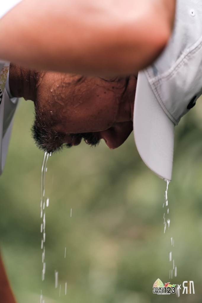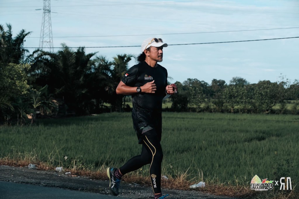 Kalimat legendaris dan misterius dari Teuku Umar saat berjalan ke Meulaboh 123 tahun lalu, tercetak di punggung kaos pelari. Kaos yang basah kuyup oleh keringat. Sejak start di depan tugu Nisero-Quaestie, sebuah tugu sederhana berbentuk kapal, di pinggir laut, lokasi penanda awal perlawanan Teuku Umar kepada Belanda, matahari tinggi sudah langsung “menghukum” para pelari. Pukul 9 pagi kurang 4 menit, atau sekitar tiga jam meleset dari jadwal awal. Dan selanjutnya adalah kisah tubuh-tubuh panas jalanan yang terkuras cepat staminanya, cair ke aspal. Jalanan ke arah Meulaboh, aspal mulus datar lurus panjang dengan belokan-belokan kecil yang hanya untuk menyuguhkan kembali pemandangan serupa, perlahan menguapkan mental pelari ke udara.