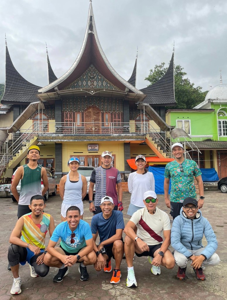 Subuh, langit masih gelap, berkendara sekitar 45 menit dari penginapan di Bukit Tinggi, sambil membincangkan ayam pop semalam yang enaknya kebangetan. Mengarungi jalur Kelok 44 yang ngetop itu, terus menurun, sembari menghitung mundur, 44 43 42 dan seterusnya (kirain cuma istilah, macam JKT48, gak taunya beneran ada 44 kelokan). Dan persis lepas turunan terakhir, kelok 1, berbelok ke kanan sedikit, masuk pelataran parkir Sekretariat Kerapatan Adat Nagari (KAN), dekat SMAN 1 Tanjung Raya itu lho, di sanalah runventure -bersembilan pelari, CaptAdi OmAdem CF Anne Babab Arif Iwa Salmond NH, ditemani DaImam dan NiIcha yang penyabar- kali ini akan dimulai.