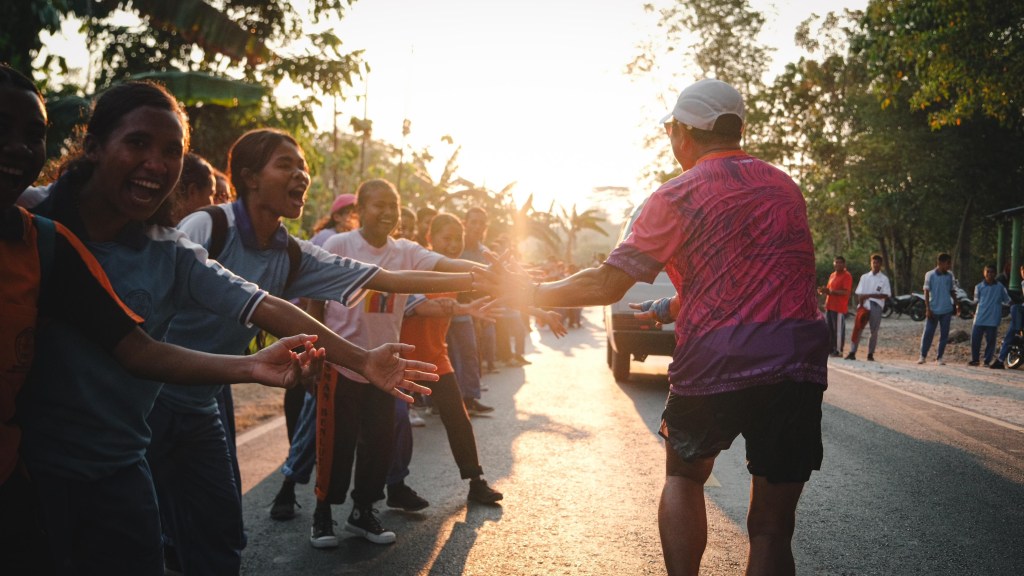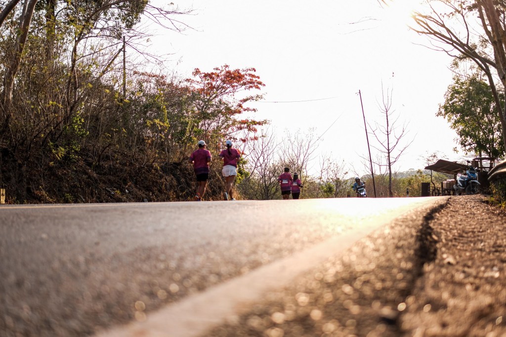 Meluncur turun dari SoE, di ketinggian 900 mdpl berangin sejuk, ke Check Point (CP) pertama KM25 (sekitar 200 mdpl), semua terasa ringan dan mudah. Masih bisa bersorak dan bertepuk tangan bersama anak-anak yang berbaris di jalanan, dan yang setia menunggu menyambut saat memasuki CP. Tiga jam perjalanan berlari, masih segar, masih belum mampu membuat perut kelaparan, masih cukup diganjal dengan pisang goreng dan teh manis hangat di CP.