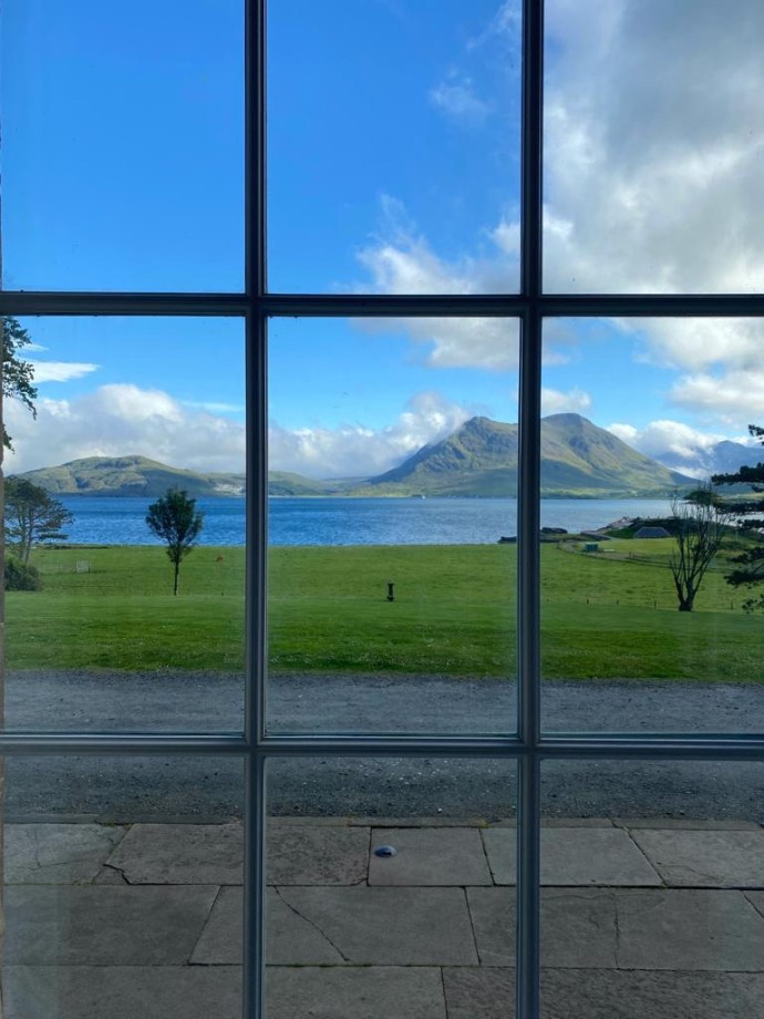 Jalan kecil berkerikil hitam, hamparan luas rumput hijau pendek rapih, laut biru yang tenang, bukit-bukit hijau dataran tinggi Isle of Skye, sedikit diselimuti awan putih, dan langit biru yang terbentang luas dan tinggi.