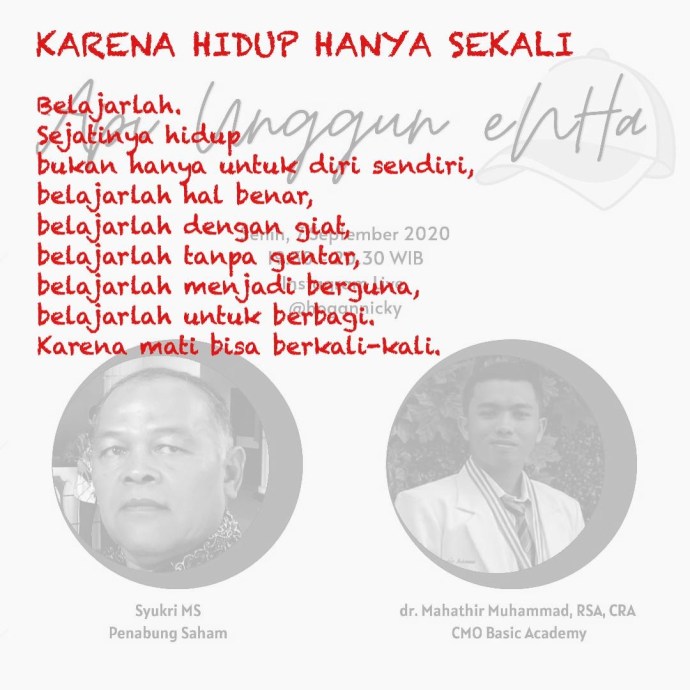 Berinvestasilah. Seperti dr Mahathir Muhammad, seorang dokter muda Banda Aceh yang ingin merdeka, dan memerdekakan. Memerdekakan negeri dari dominasi mayoritas investor asing, memerdekakan diri dari kemiskinan yang sering kali kita ciptakan sendiri, memerdekakan pikiran bahwa hidup hanya untuk hari ini. Karena hidup hanya sekali.