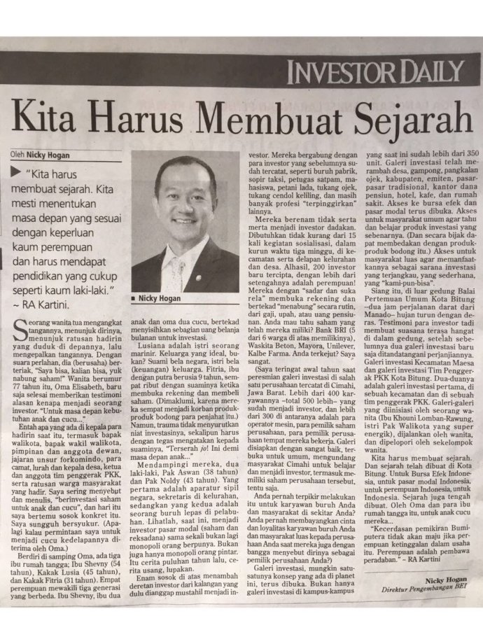 “Kita harus membuat sejarah. Kita mesti menentukan masa depan yang sesuai dengan keperluan kaum perempuan dan harus mendapat pendidikan yang cukup seperti kaum laki-laki.” ~ RA Kartini Seorang wanita tua mengangkat tangannya, menunjuk dirinya, menunjuk ratusan hadirin yang duduk di depannya, lalu mengepalkan tangannya. Dengan suara perlahan, dia (berusaha) berteriak, “Saya bisa, kalian bisa, yuk…